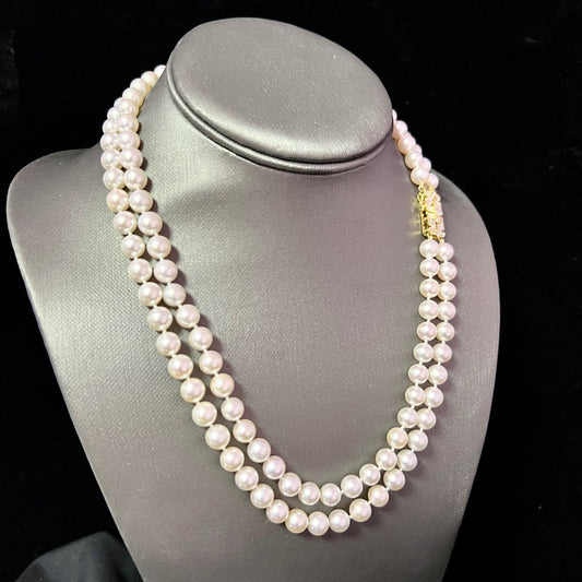 Akoya Pearl Diamond 2-Strand Gold Necklace 7.5 mm 19.25" Certified $9,975 210643