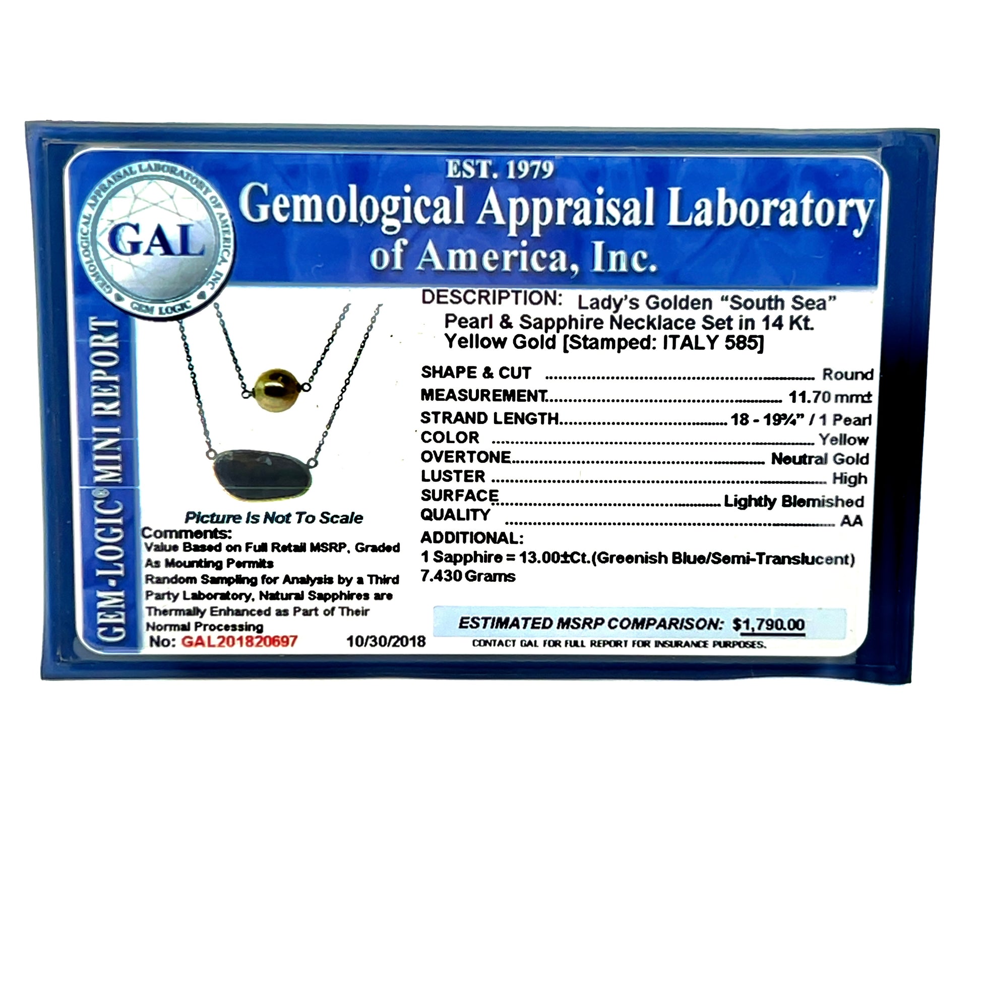 Golden South Sea Pearl Sapphire 14Kt 11.7Mm 19" Necklace Certified $1,790 820697