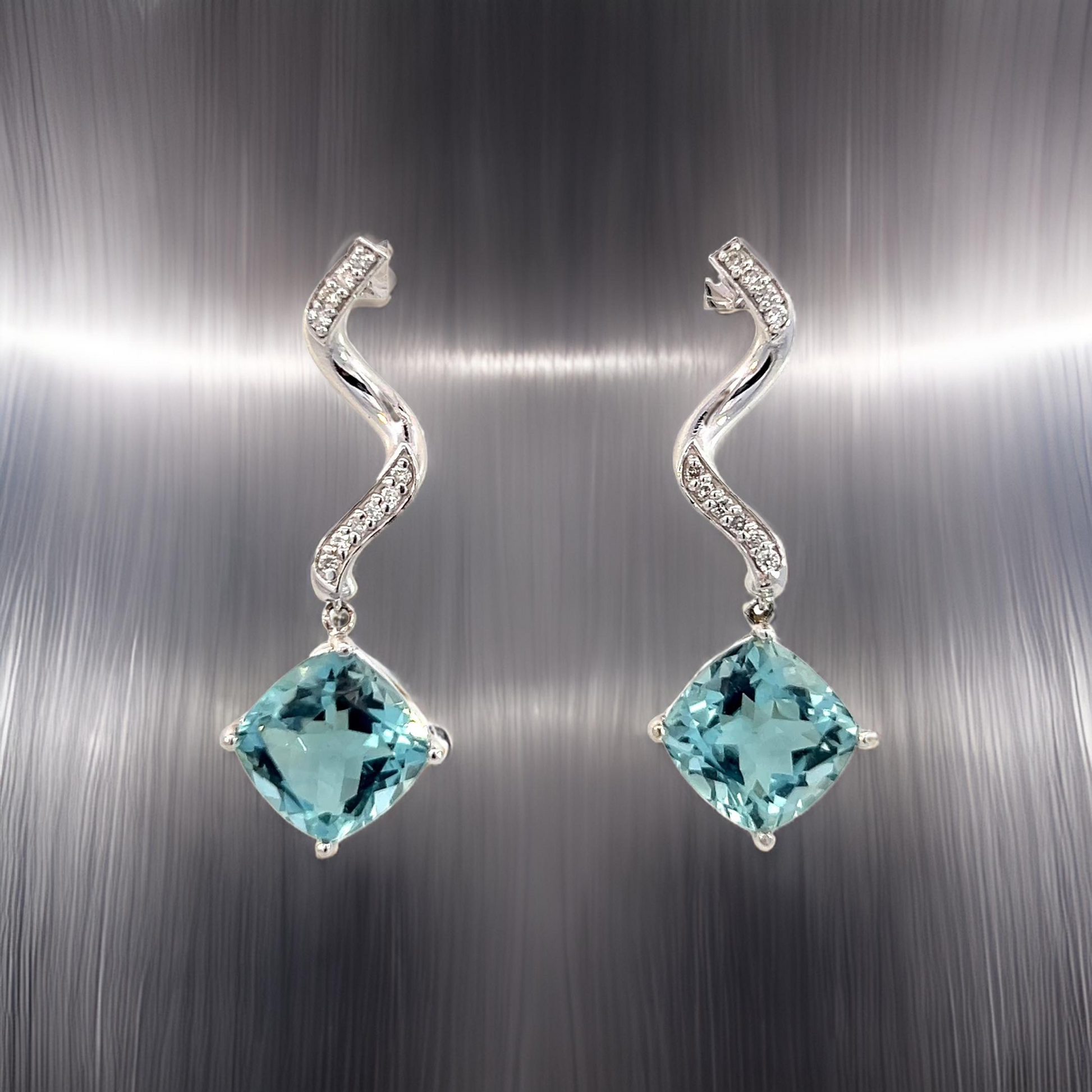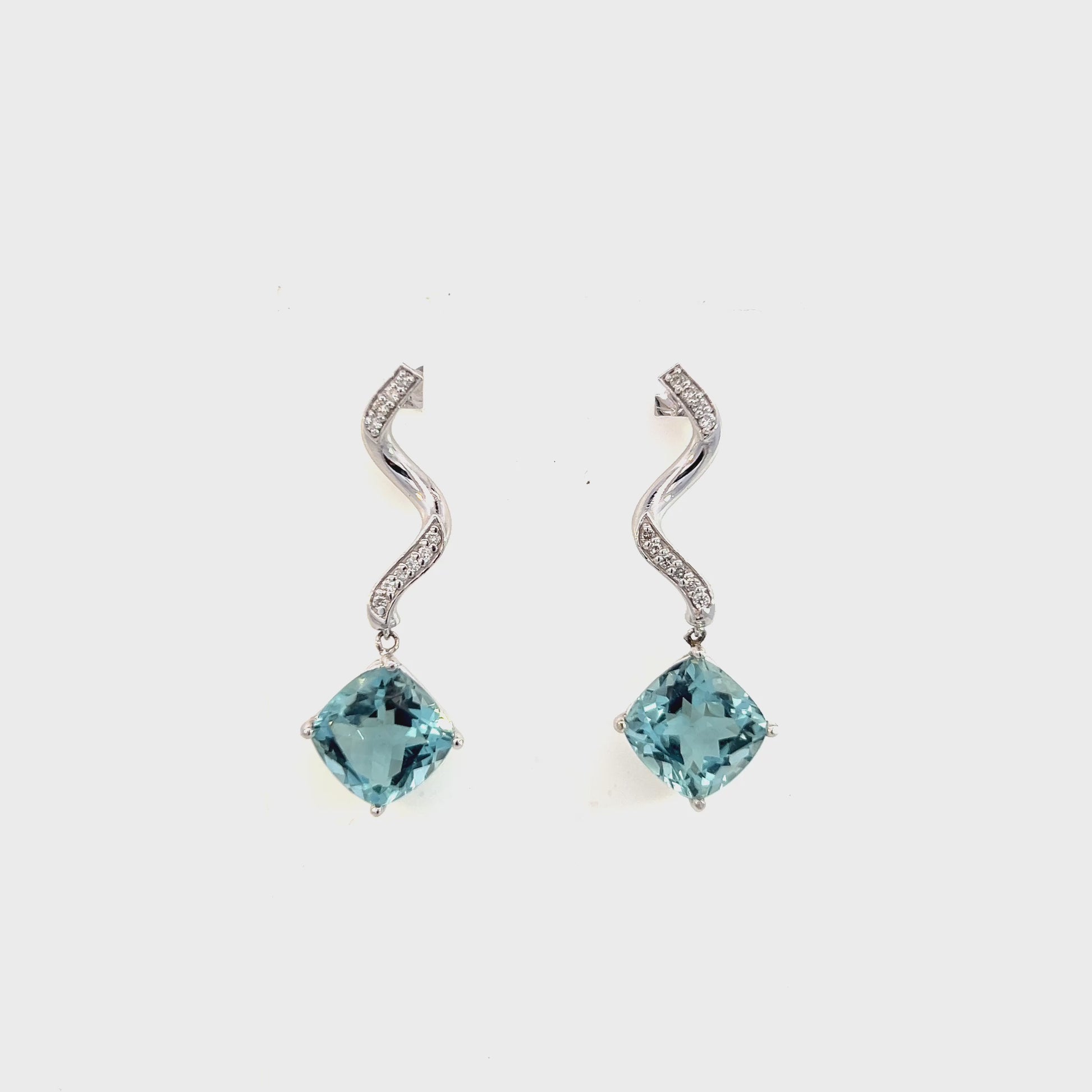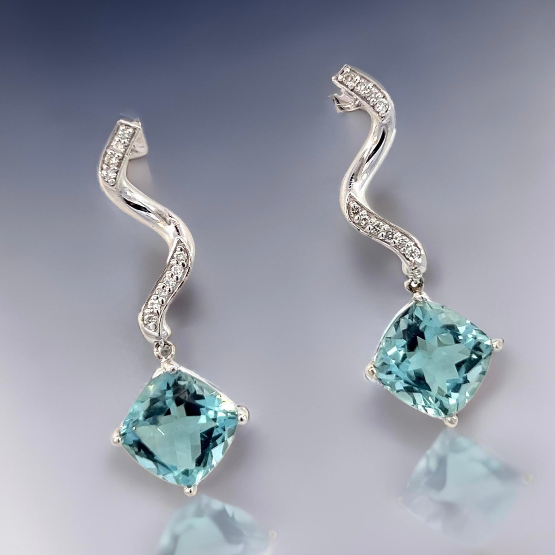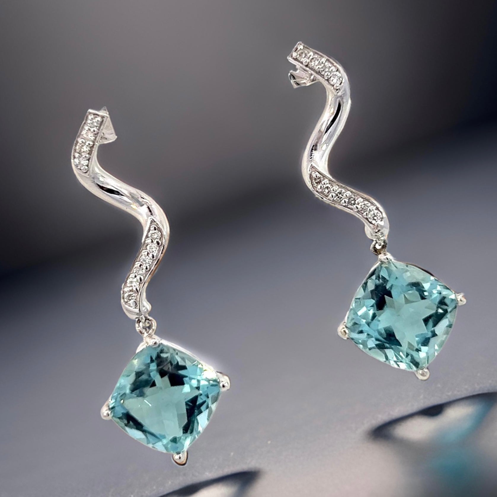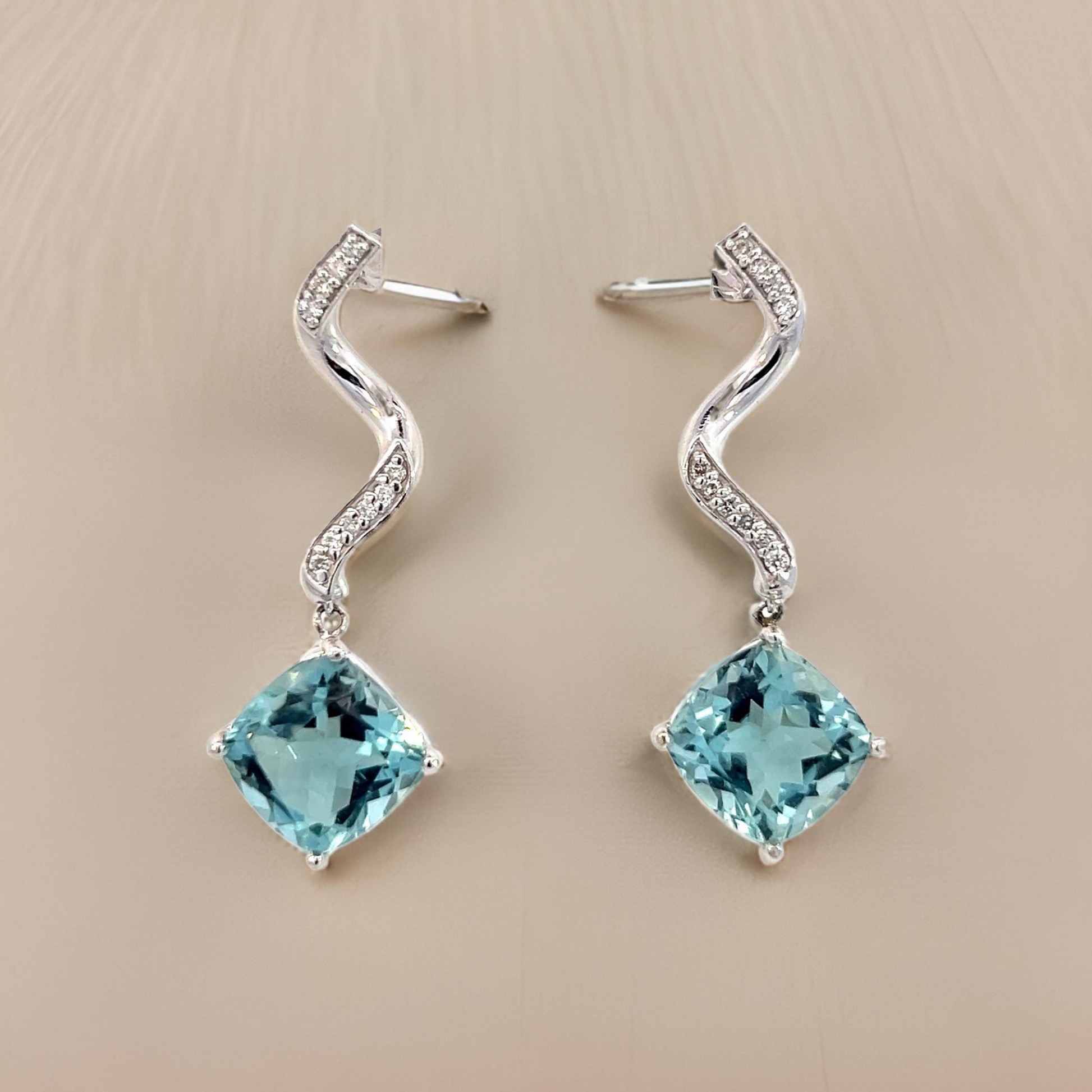 These elegant Natural Finely Faceted Aquamarine Diamond Drop Earrings feature two beautifully faceted cushion cut aquamarine gemstones that capture the light with their radiant, cool blue hue.