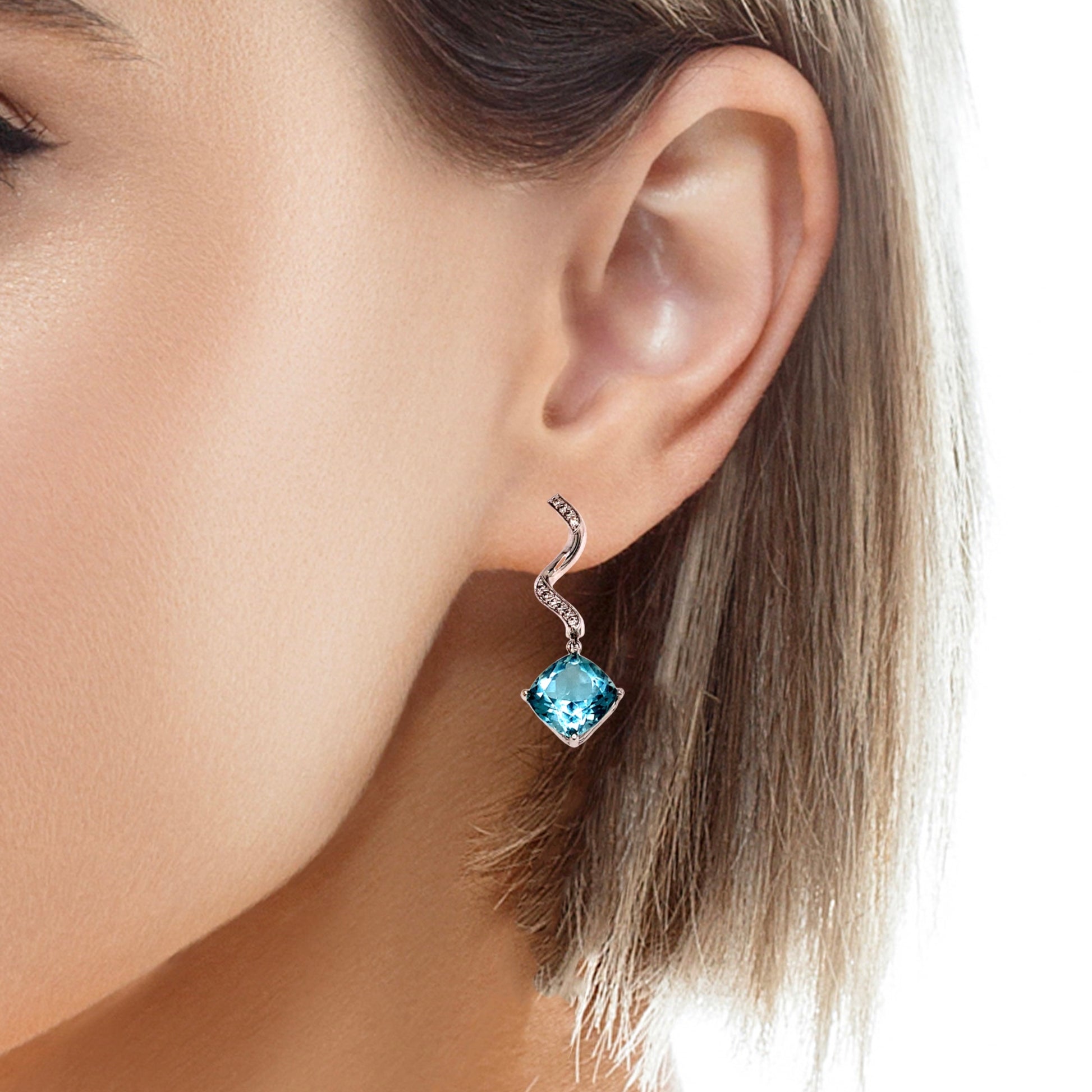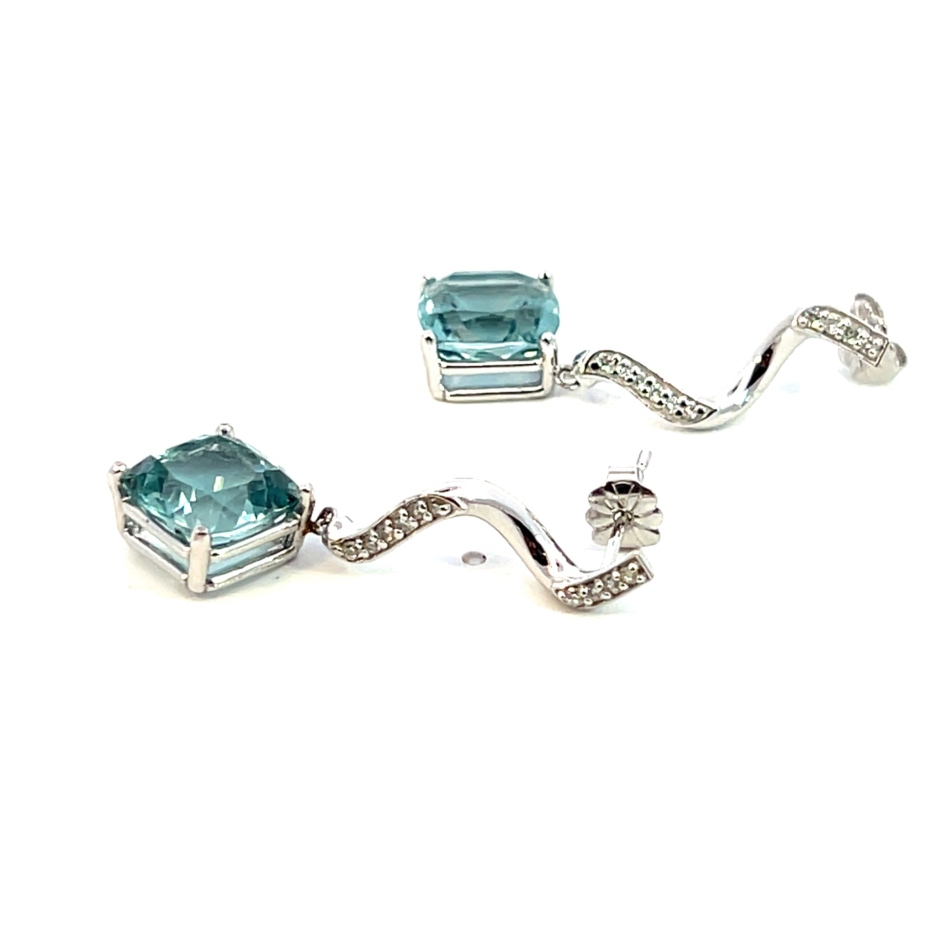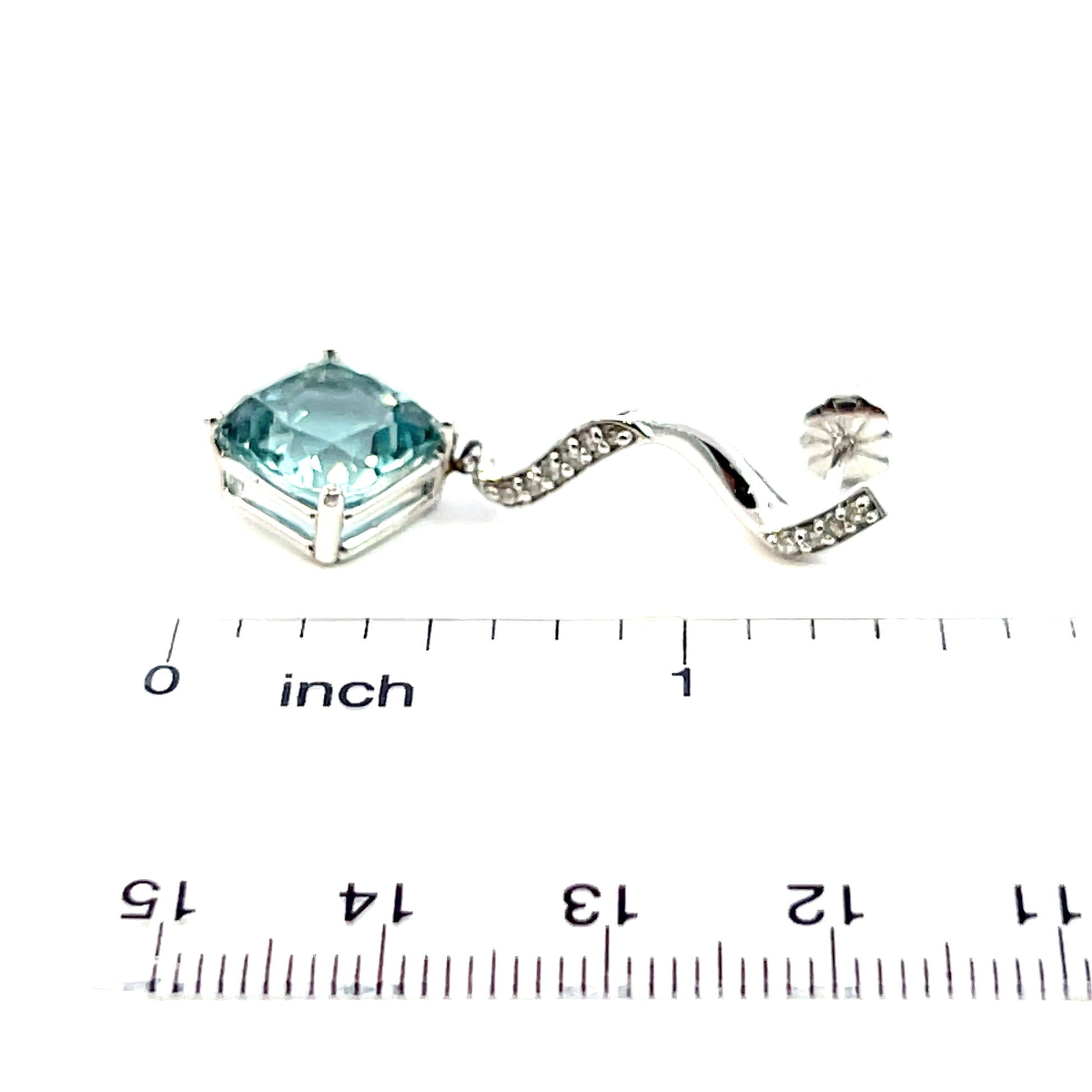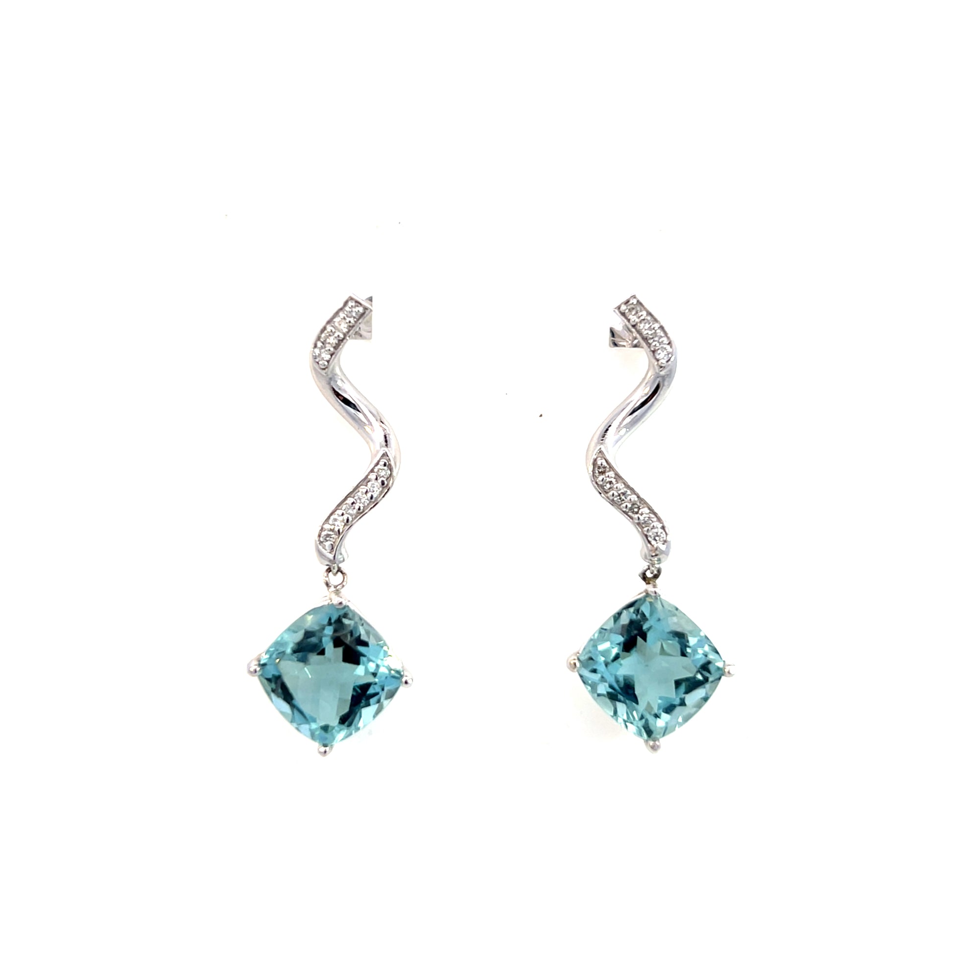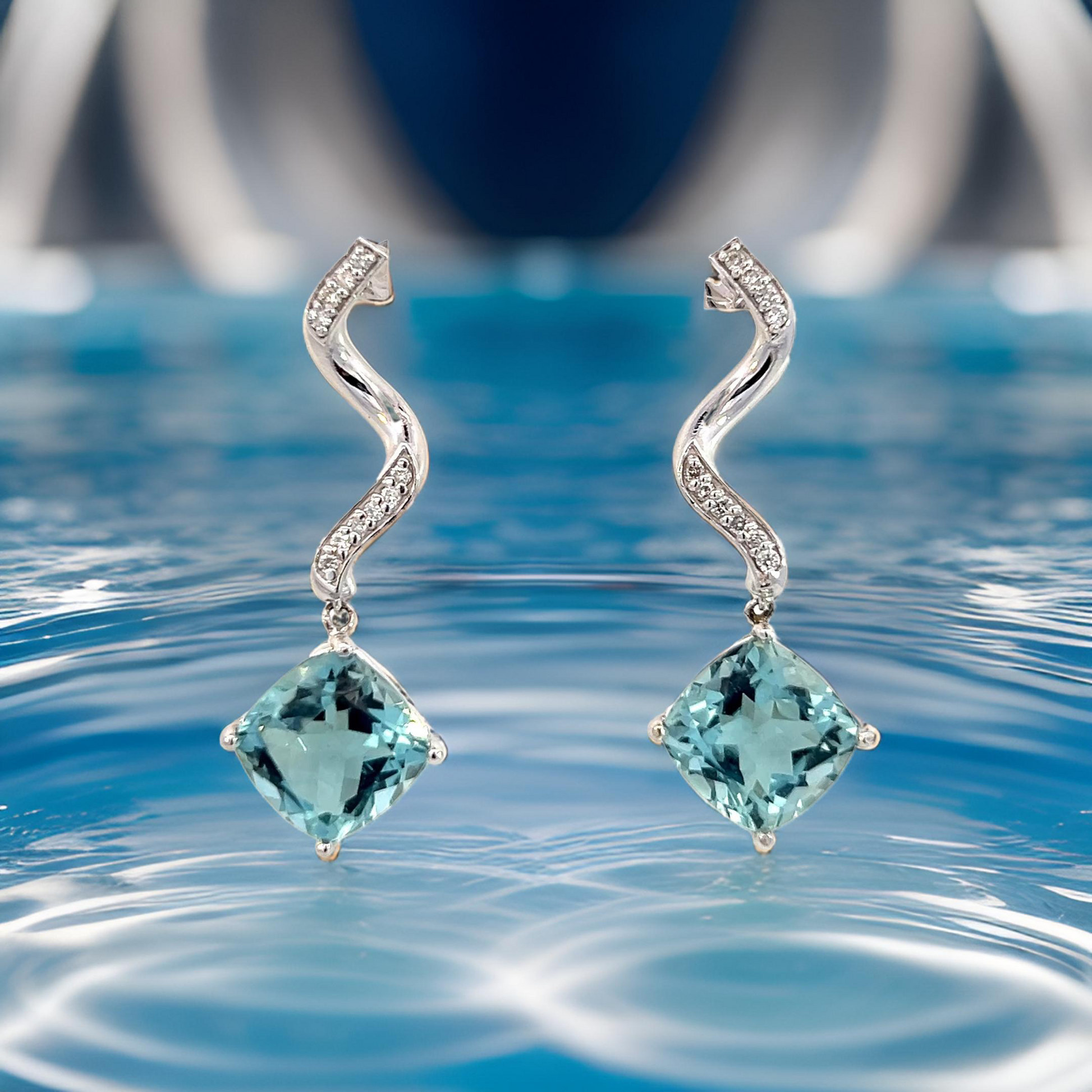 These elegant Natural Finely Faceted Aquamarine Diamond Drop Earrings feature two beautifully faceted cushion cut aquamarine gemstones that capture the light with their radiant, cool blue hue.