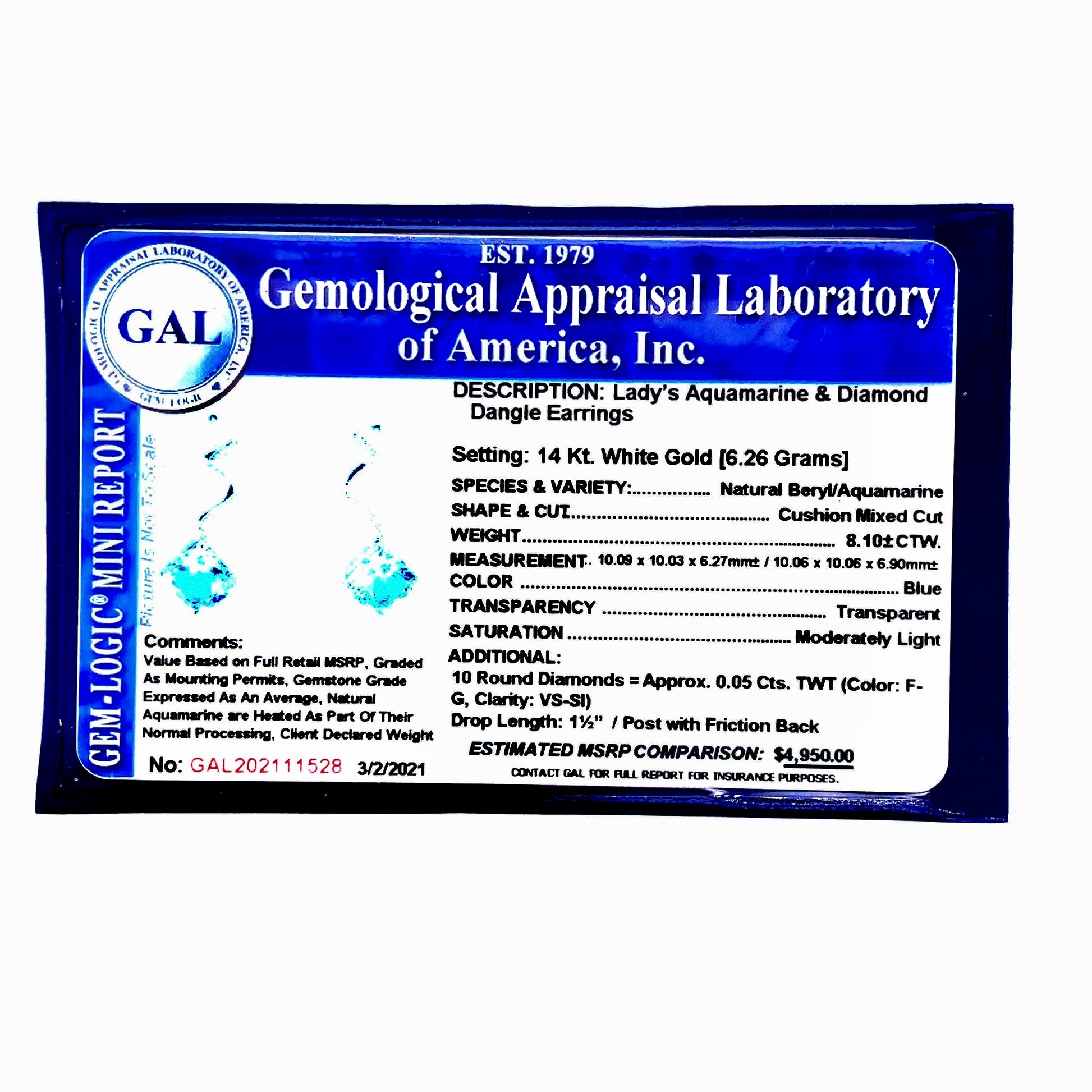 This pair of Aquamarine earrings have been Certified, Inspected, and Appraised by Gemological Appraisal Laboratory