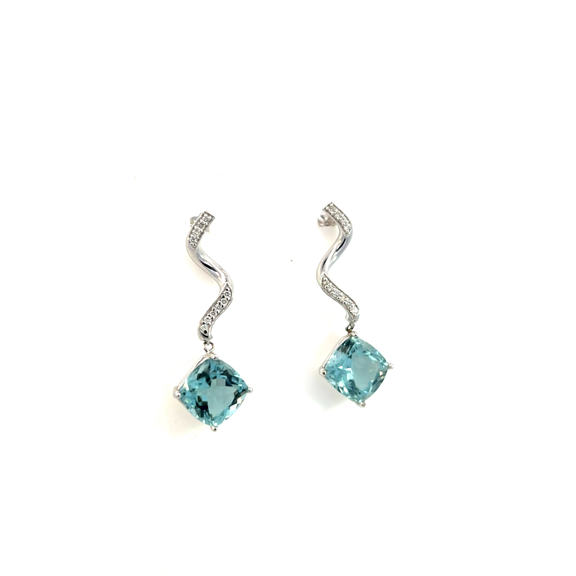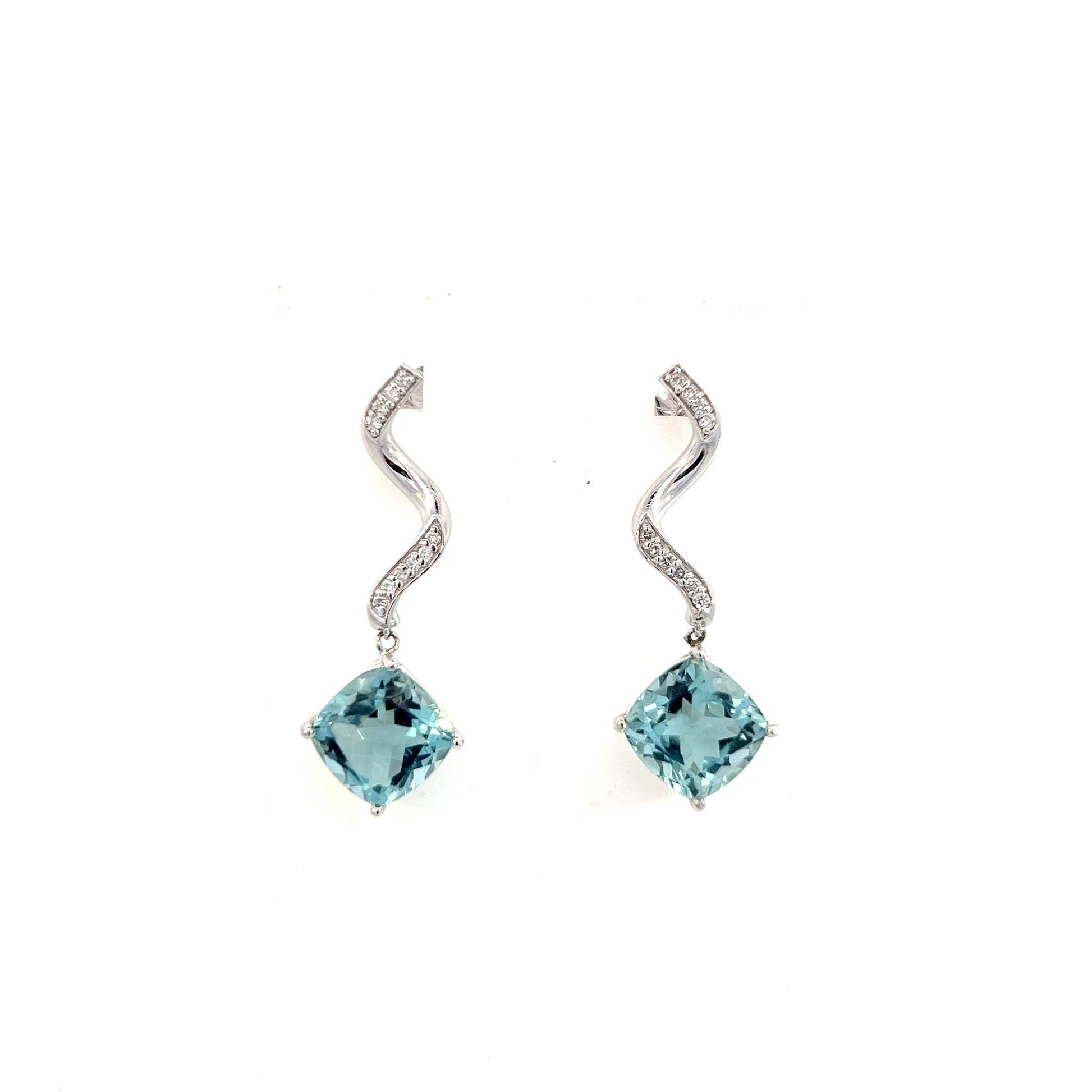 The top part of the earrings have sparkling diamonds which drop to a stunning large cushion cut aquamarine. The sparkling diamonds that add an extra layer of luxury and fire.