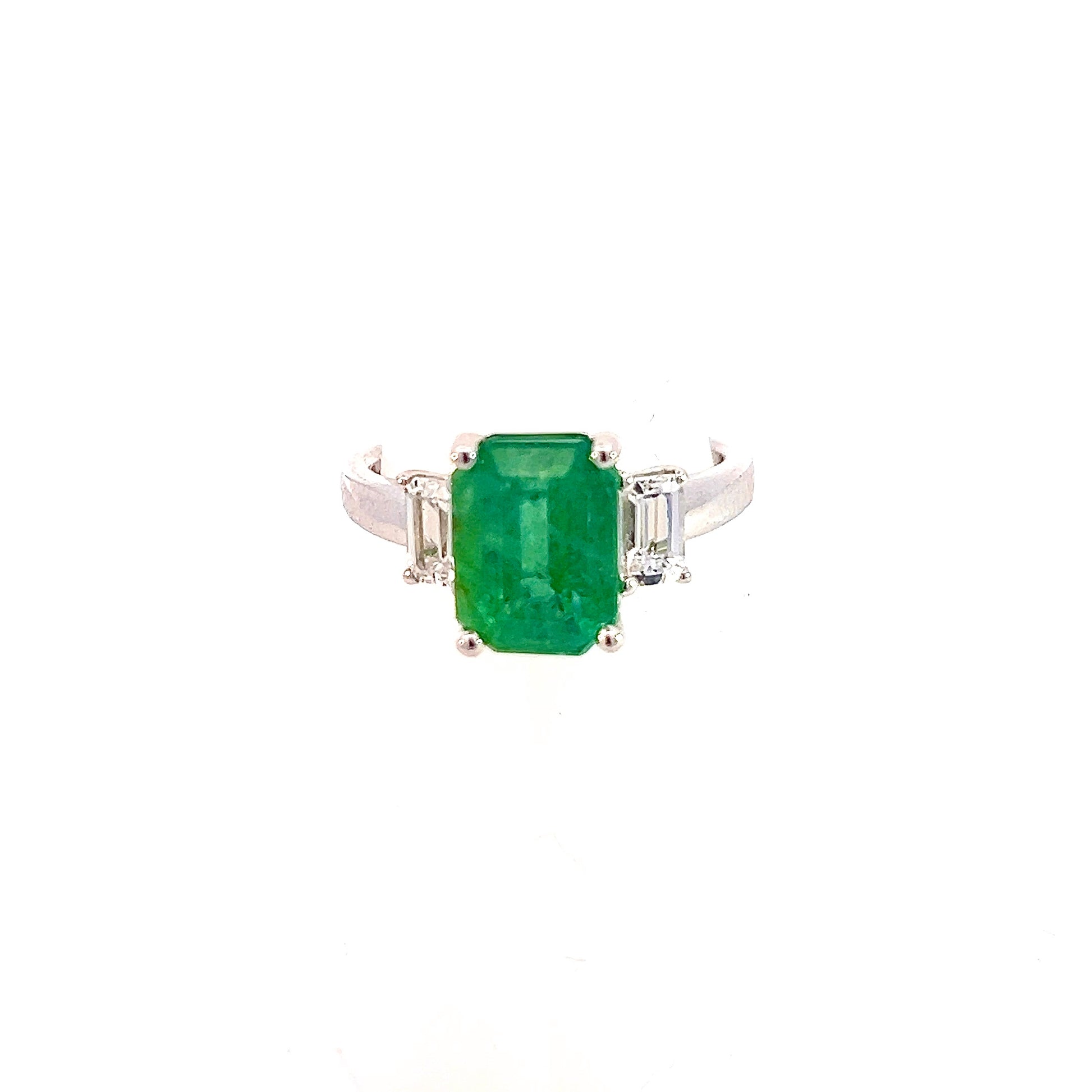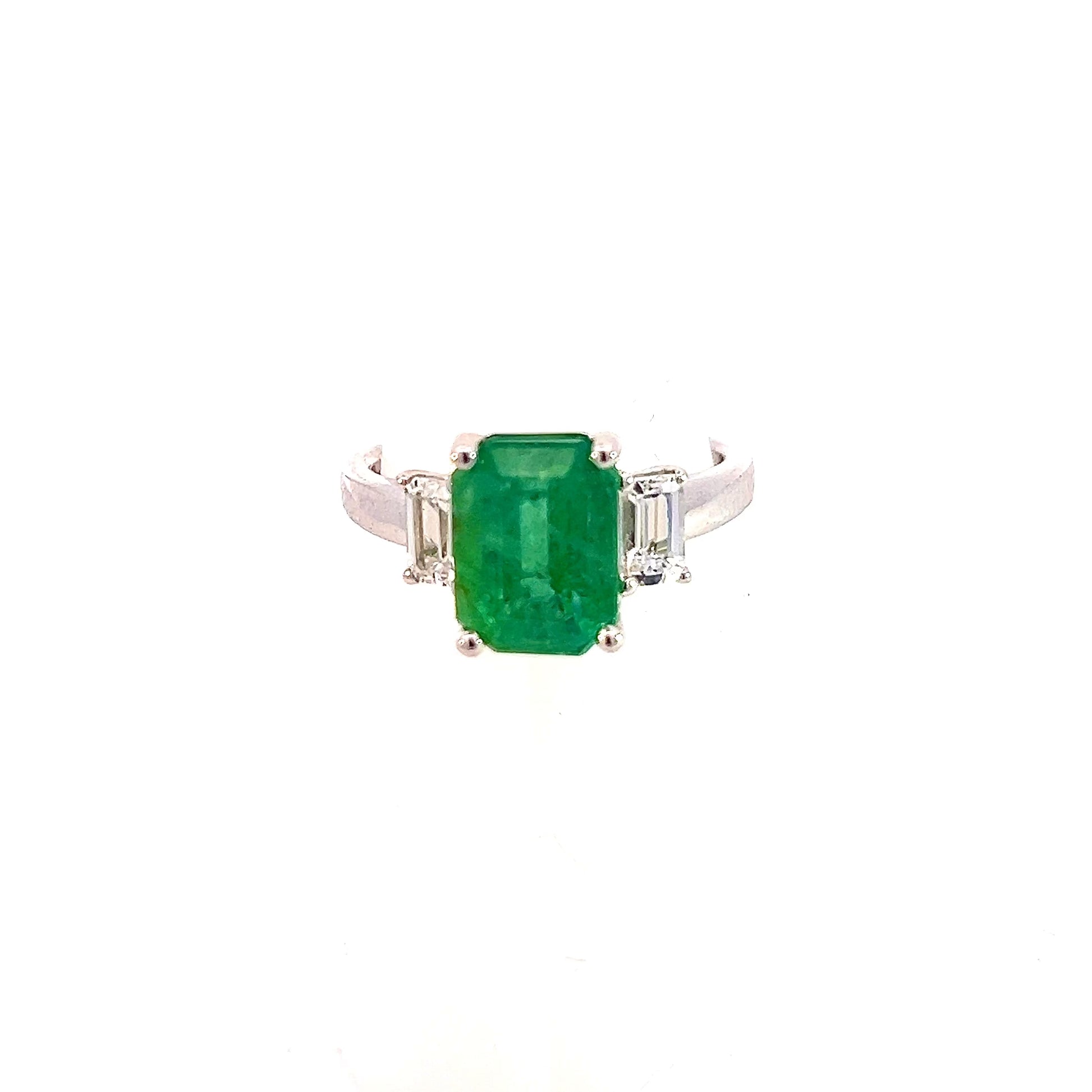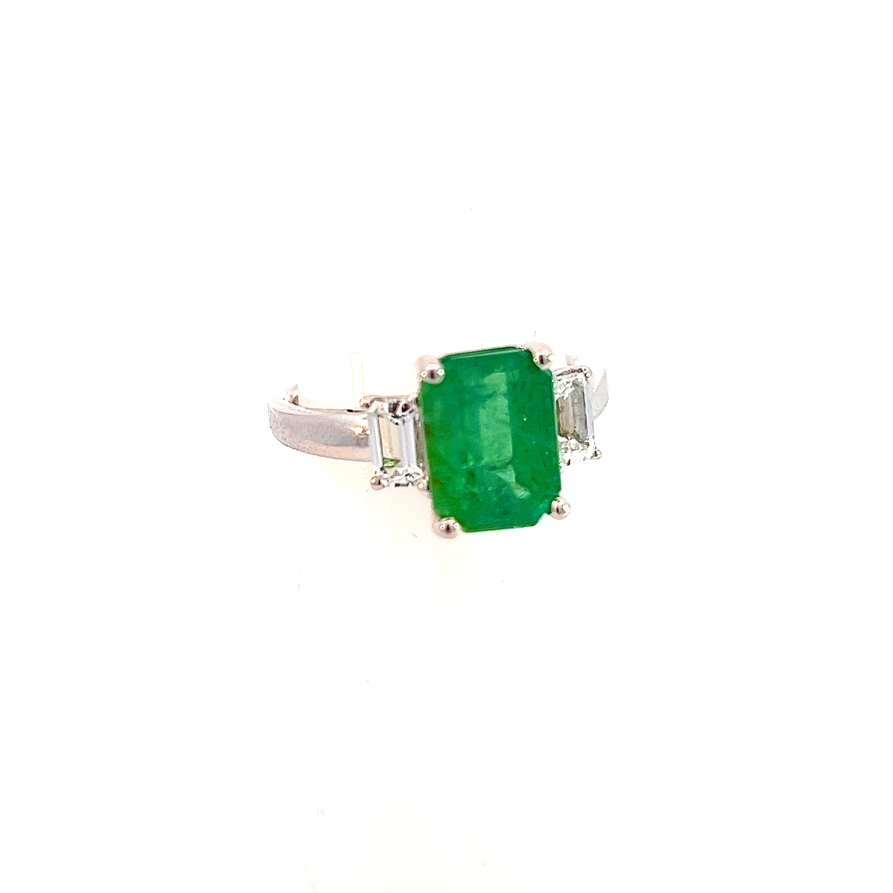 This elegant ring showcases a natural quality emerald at its center, flanked by two white sapphires on either side, creating a balanced and sophisticated design.