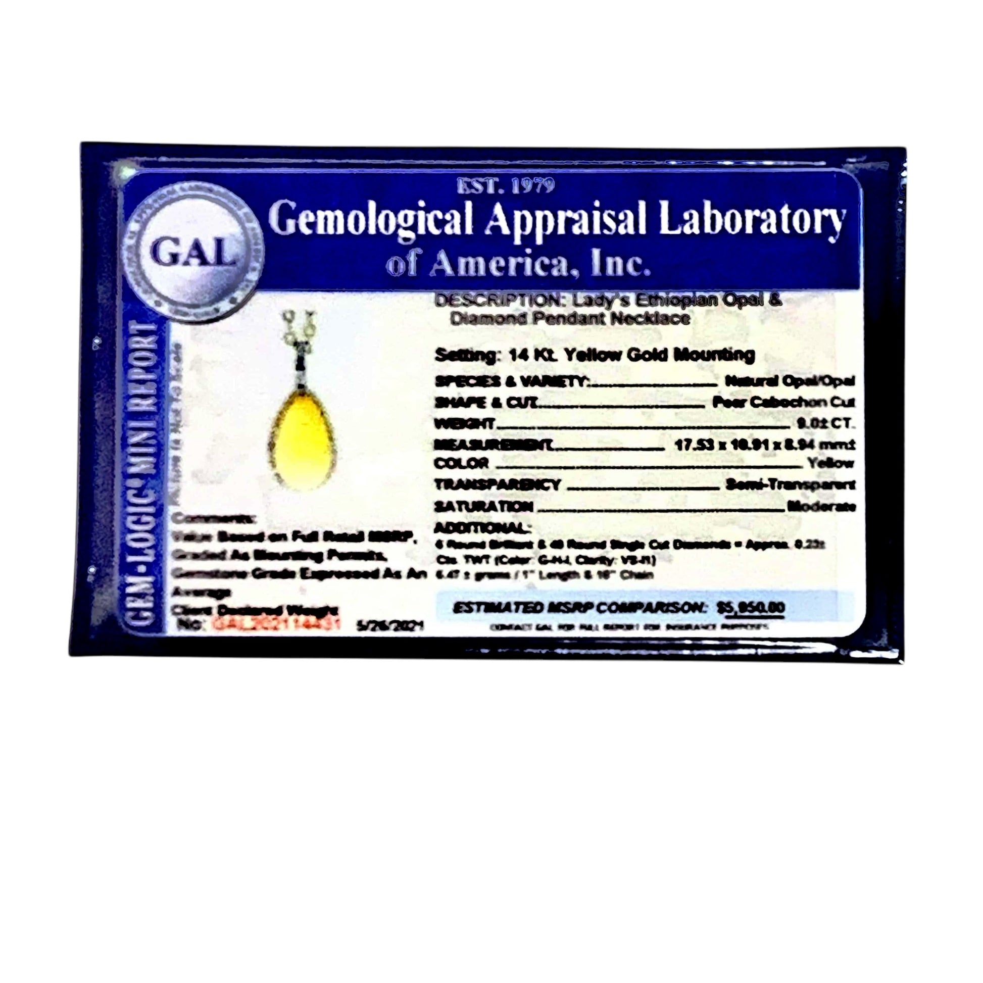 Certified and appraised by GAL at $5,950, this piece reflects its exceptional quality and design, perfect for someone seeking a rare, eye-catching pendant necklace that captures natural beauty with timeless sophistication.