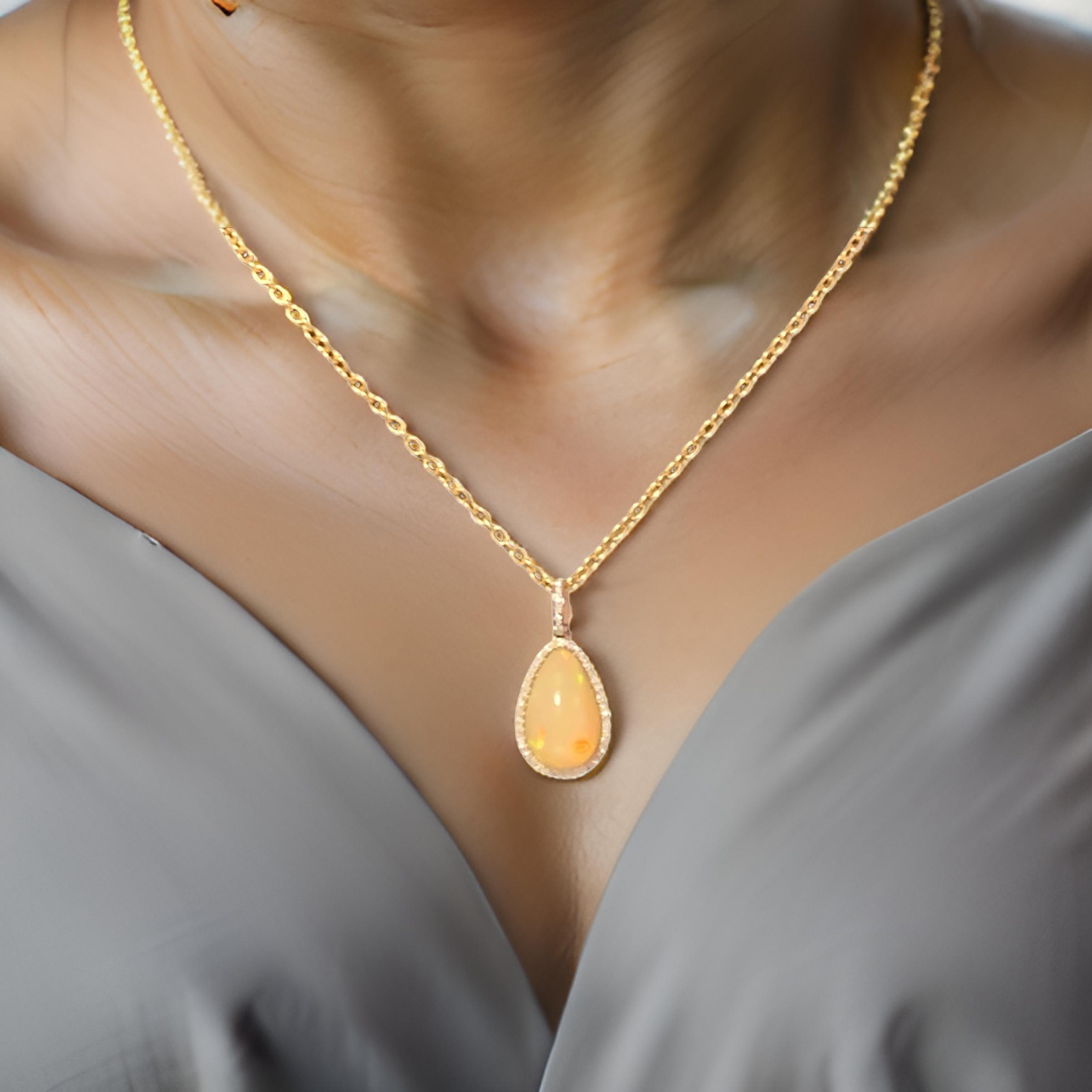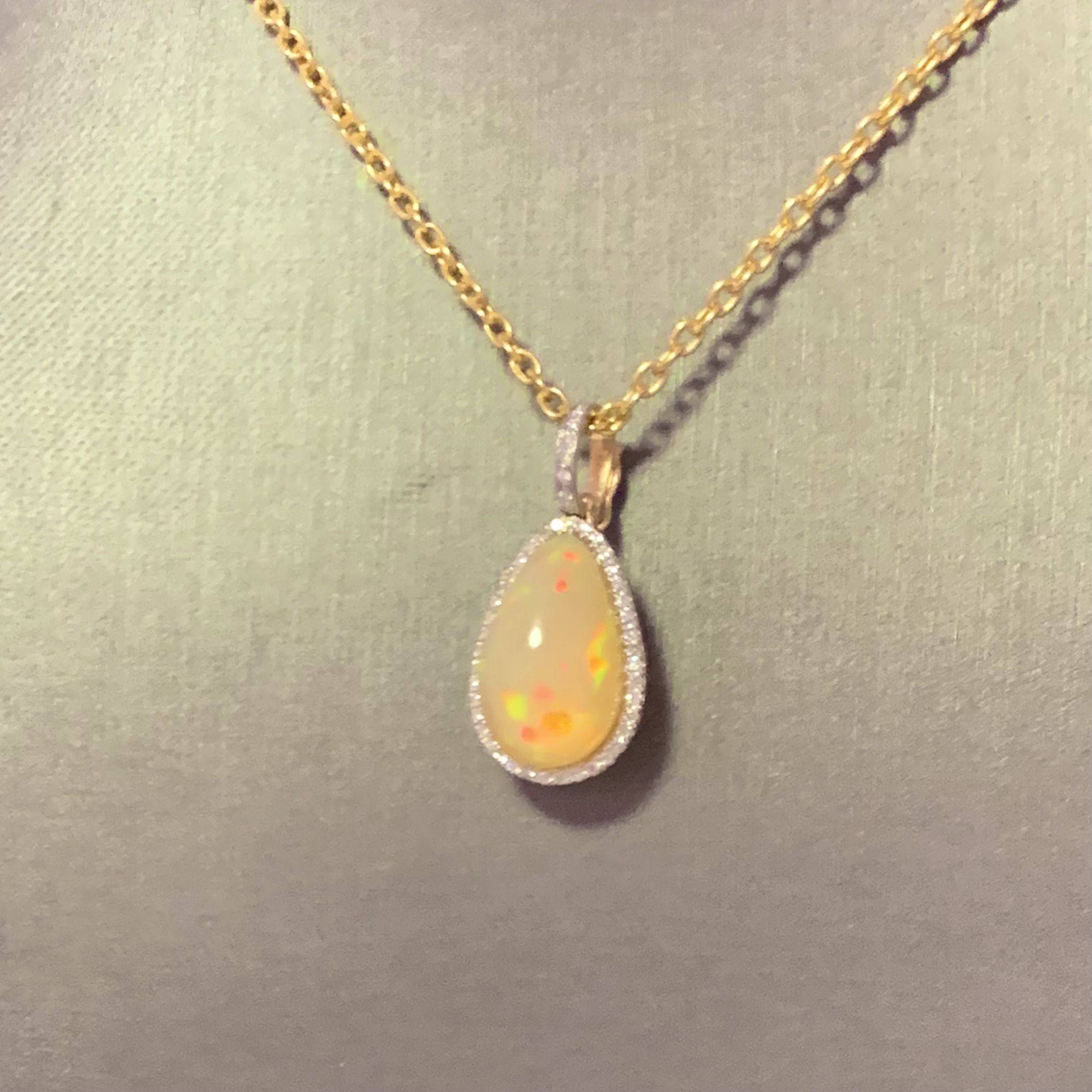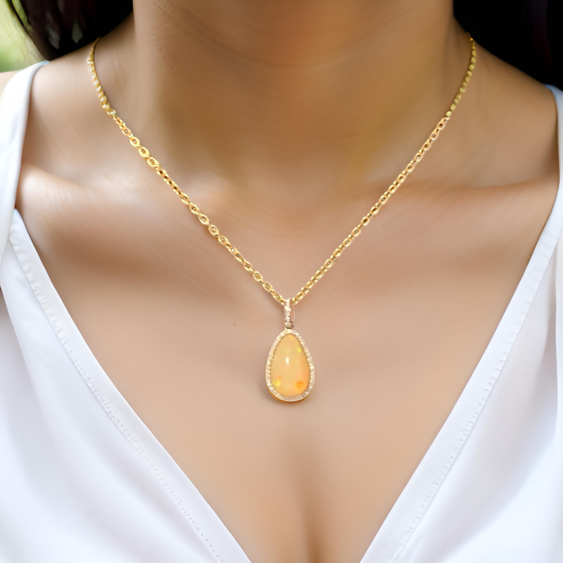 This stunning necklace features a unique, high-quality Ethiopian opal pendant in a large pear shape, radiating with an exquisite play of colors.