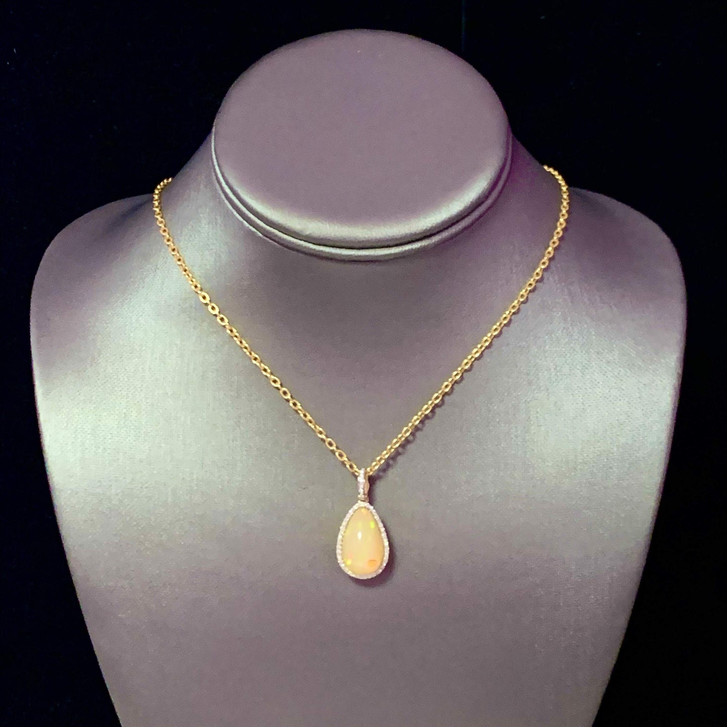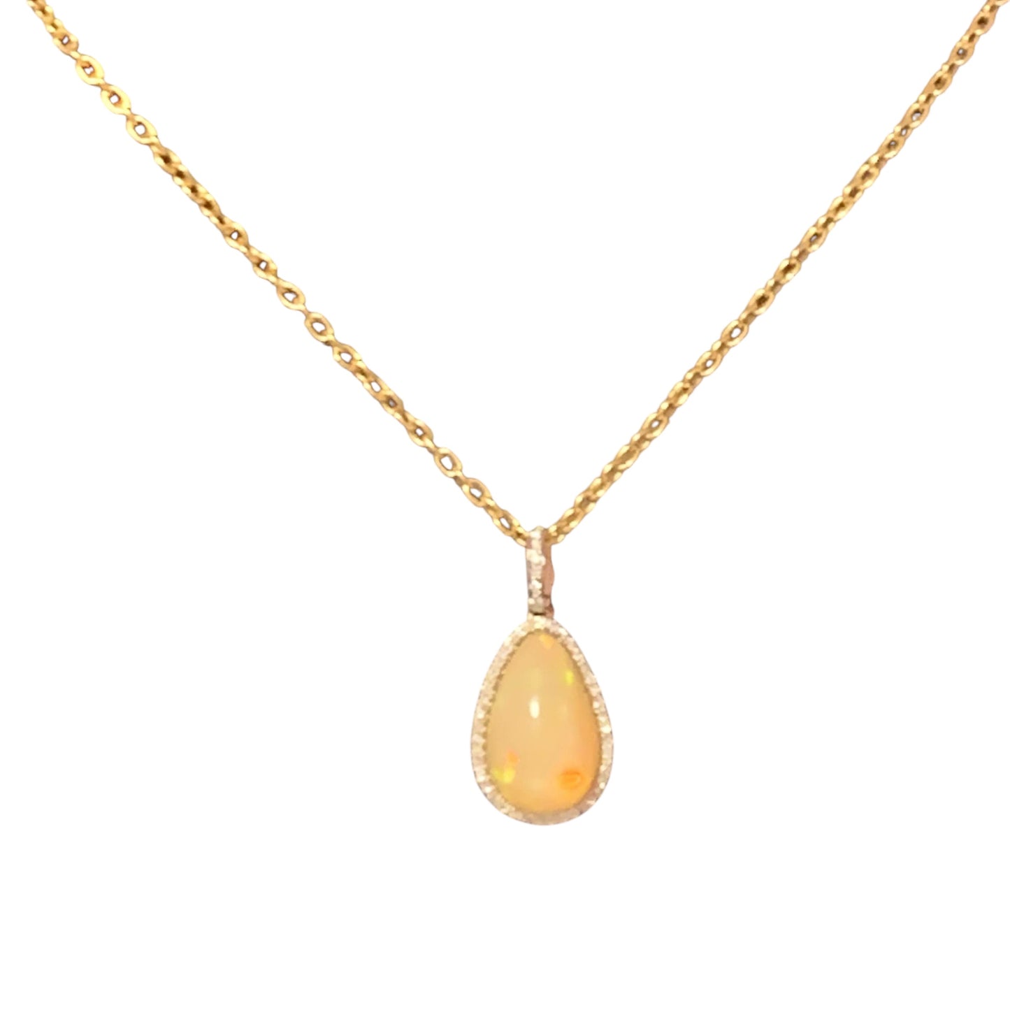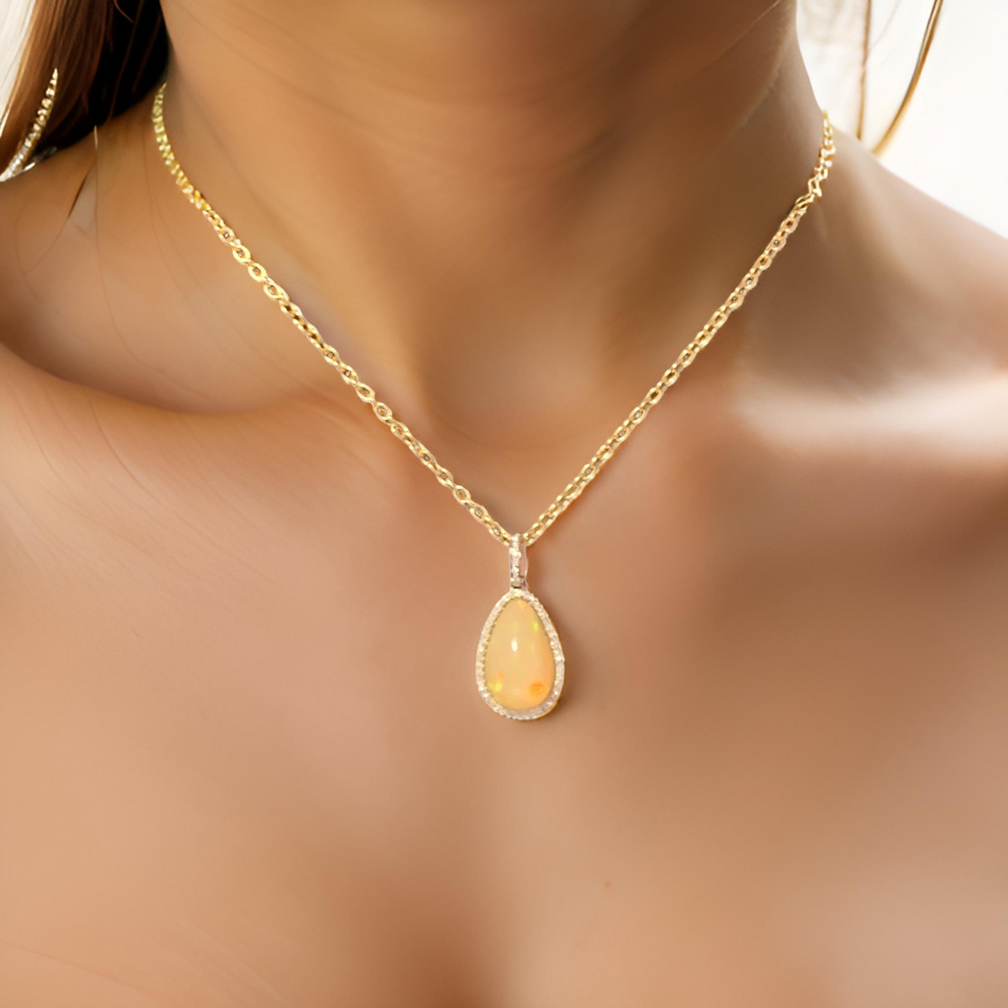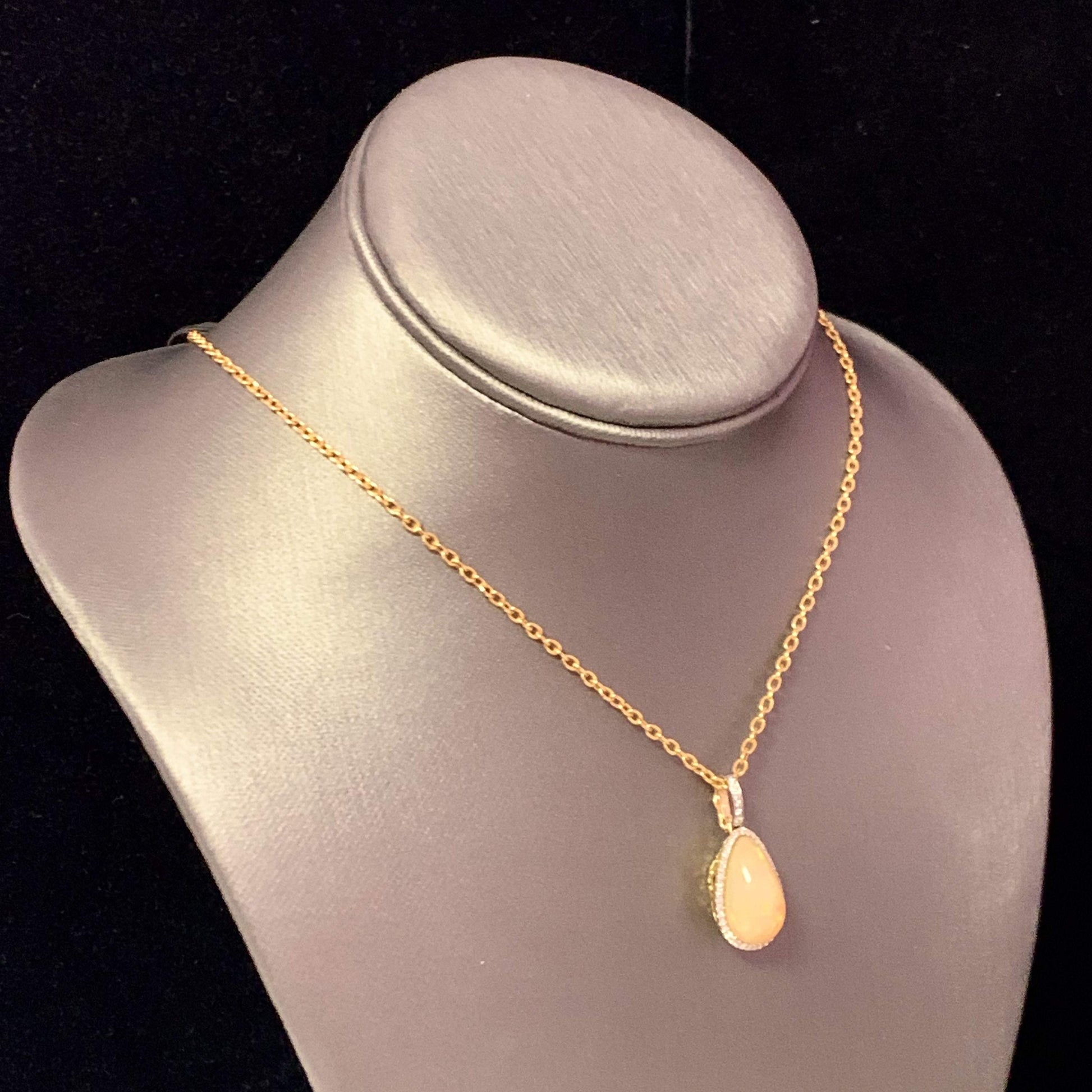 This stunning necklace features a unique, high-quality Ethiopian opal pendant in a large pear shape, radiating with an exquisite play of colors.