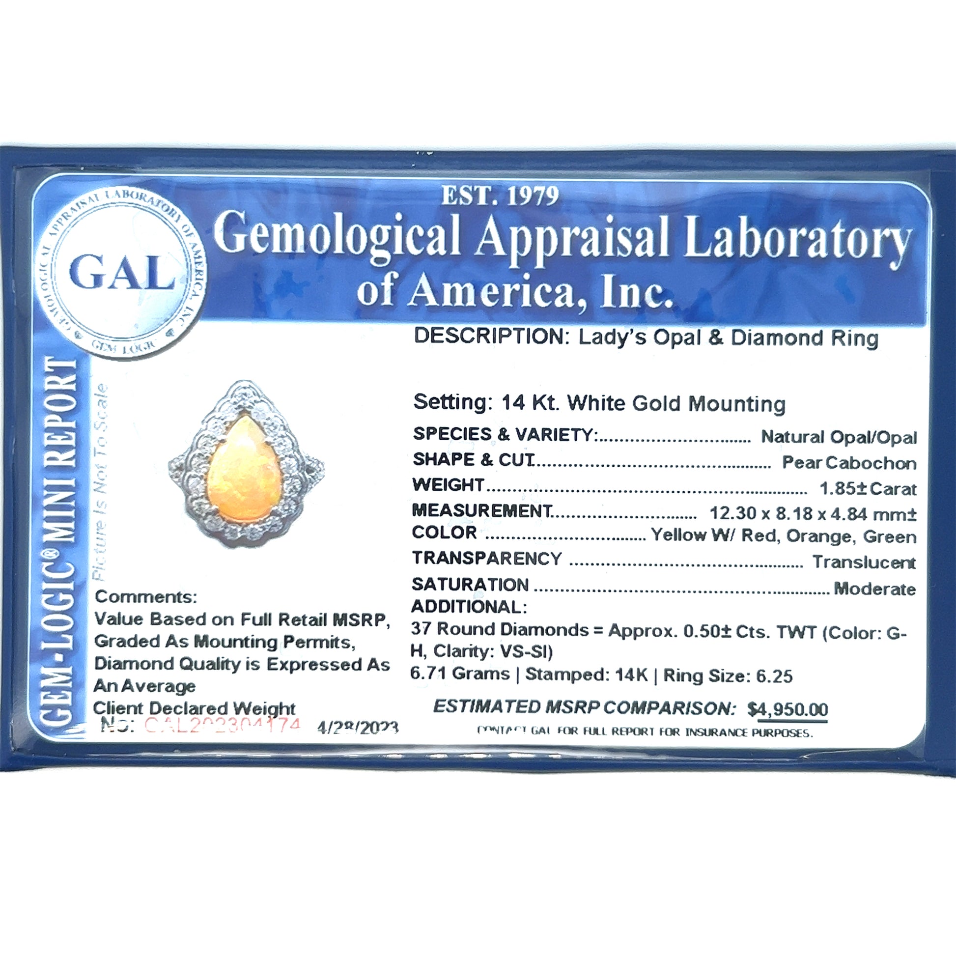 This white Opal ring has been Certified, Inspected, and Appraised by Gemological Appraisal Laboratory