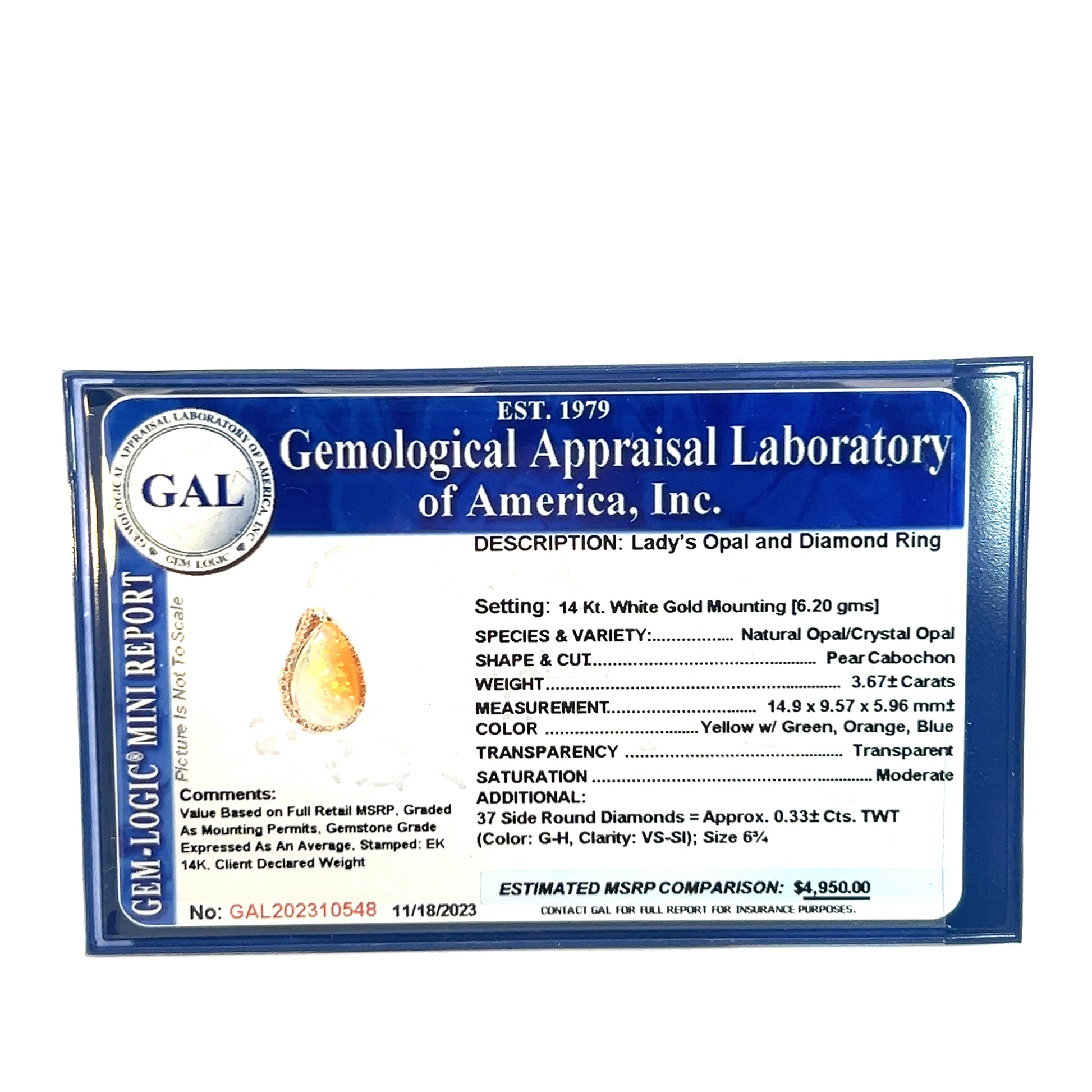 Natural Fine Quality Opal Diamond Ring 6.75 14k W Gold 4 TCW Certified $4,950 310548
