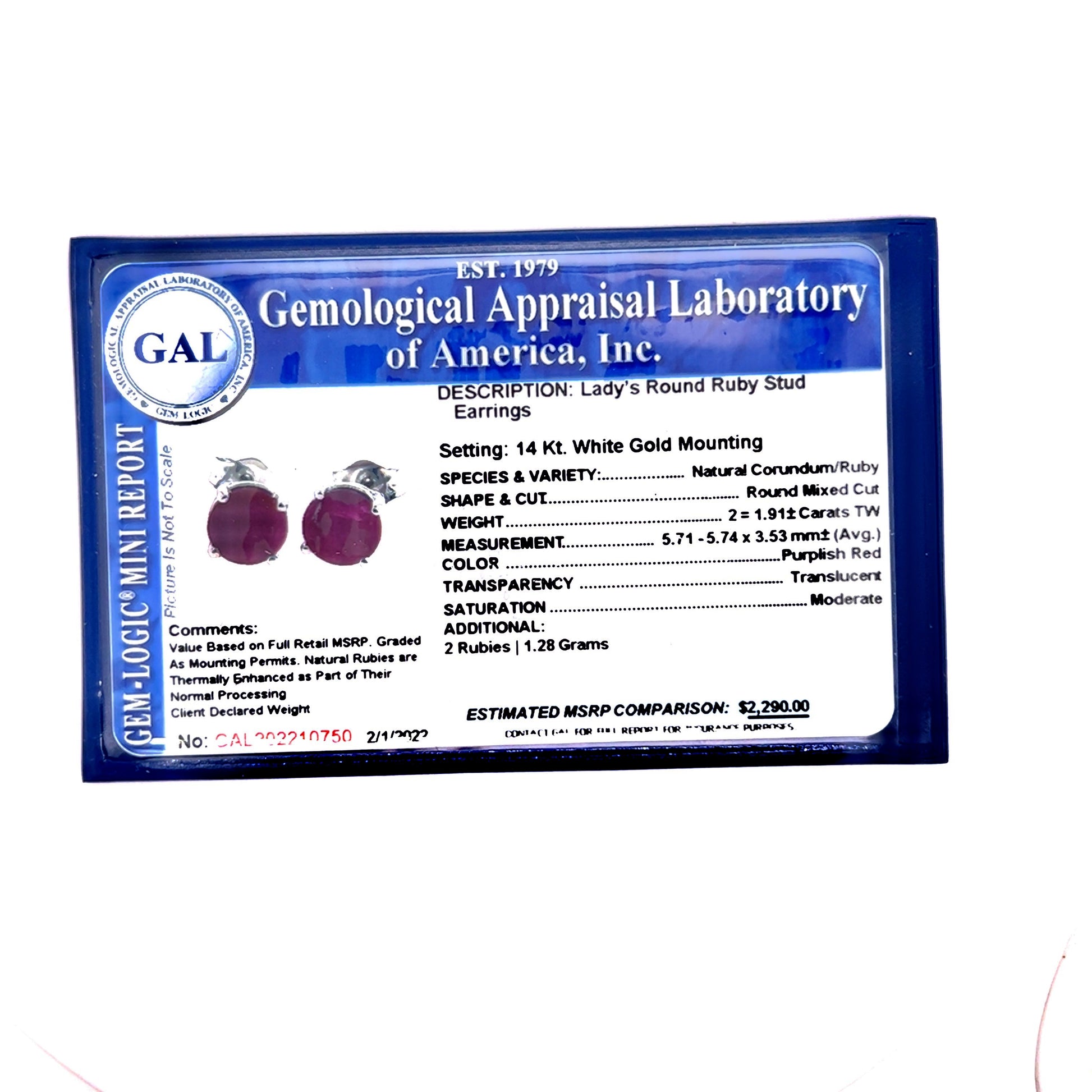 Certified and appraised by the Gemological Appraisal Laboratory (GAL) for $2,290, these ruby studs ensure both quality and authenticity.
