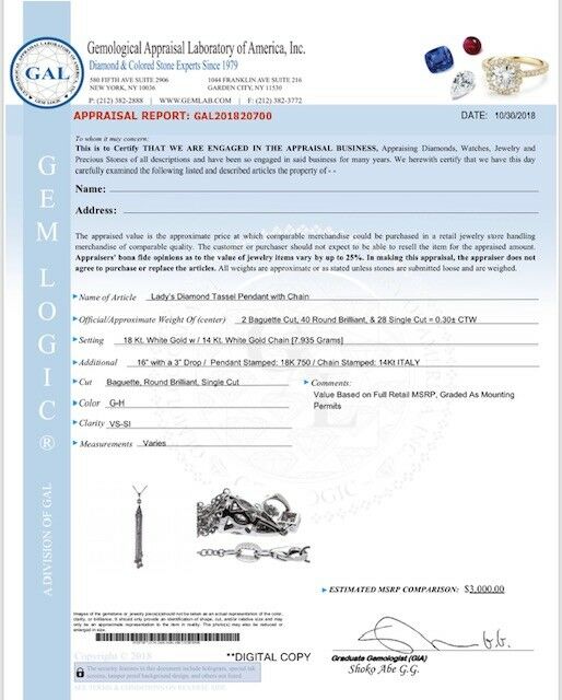 This Diamond necklace has been Certified, Inspected, and Appraised by Gemological Appraisal Laboratory