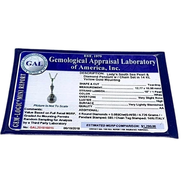 Fine Quality South Sea Pearl Diamond Necklace 12.77 mm 14k Gold Italy Certified $1,290 816015