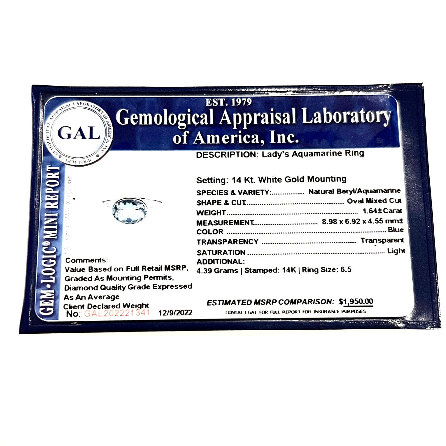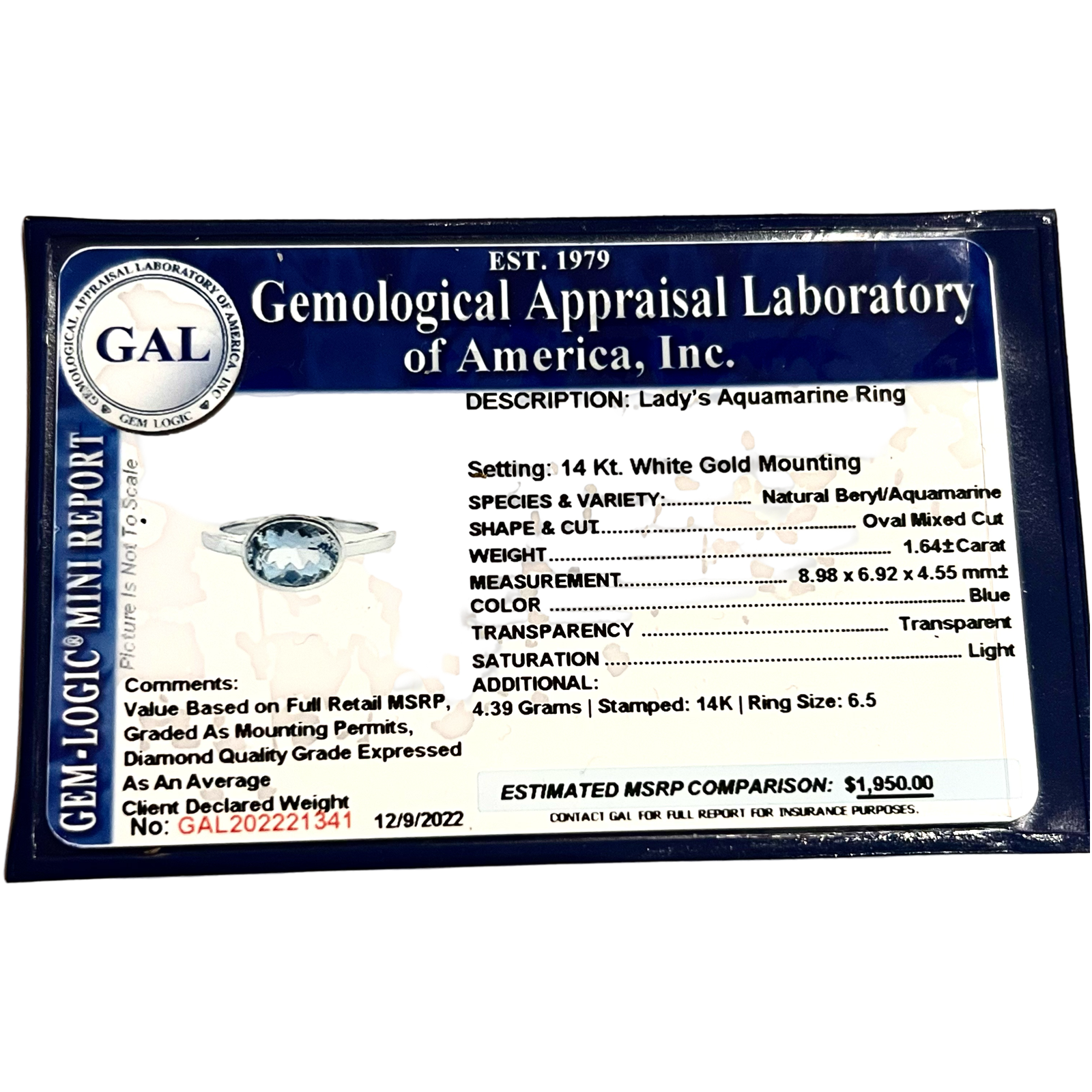 This Aquamarine ring has been Certified, Inspected, and Appraised by Gemological Appraisal Laboratory