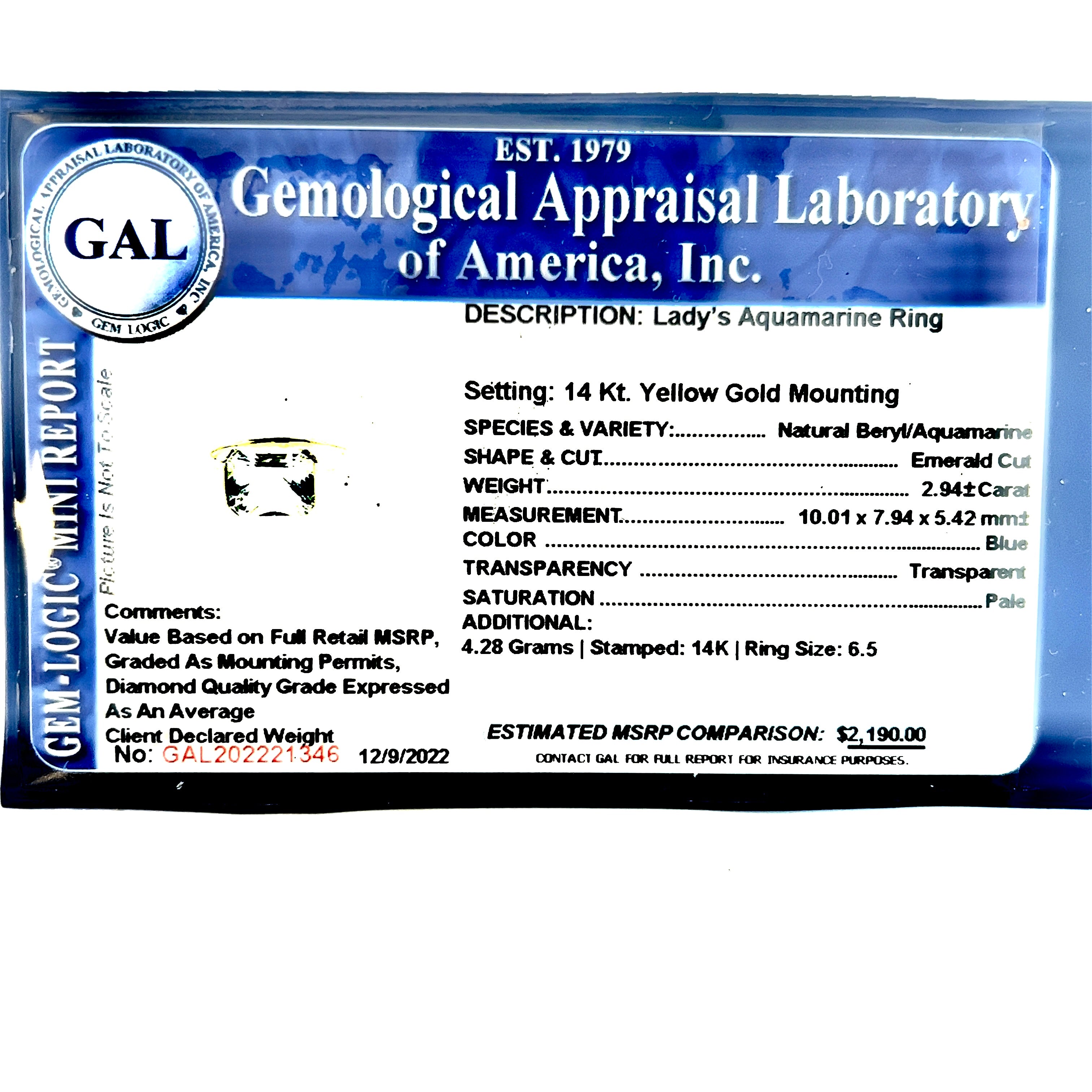 This Aquamarine ring has been Certified, Inspected, and Appraised by Gemological Appraisal Laboratory