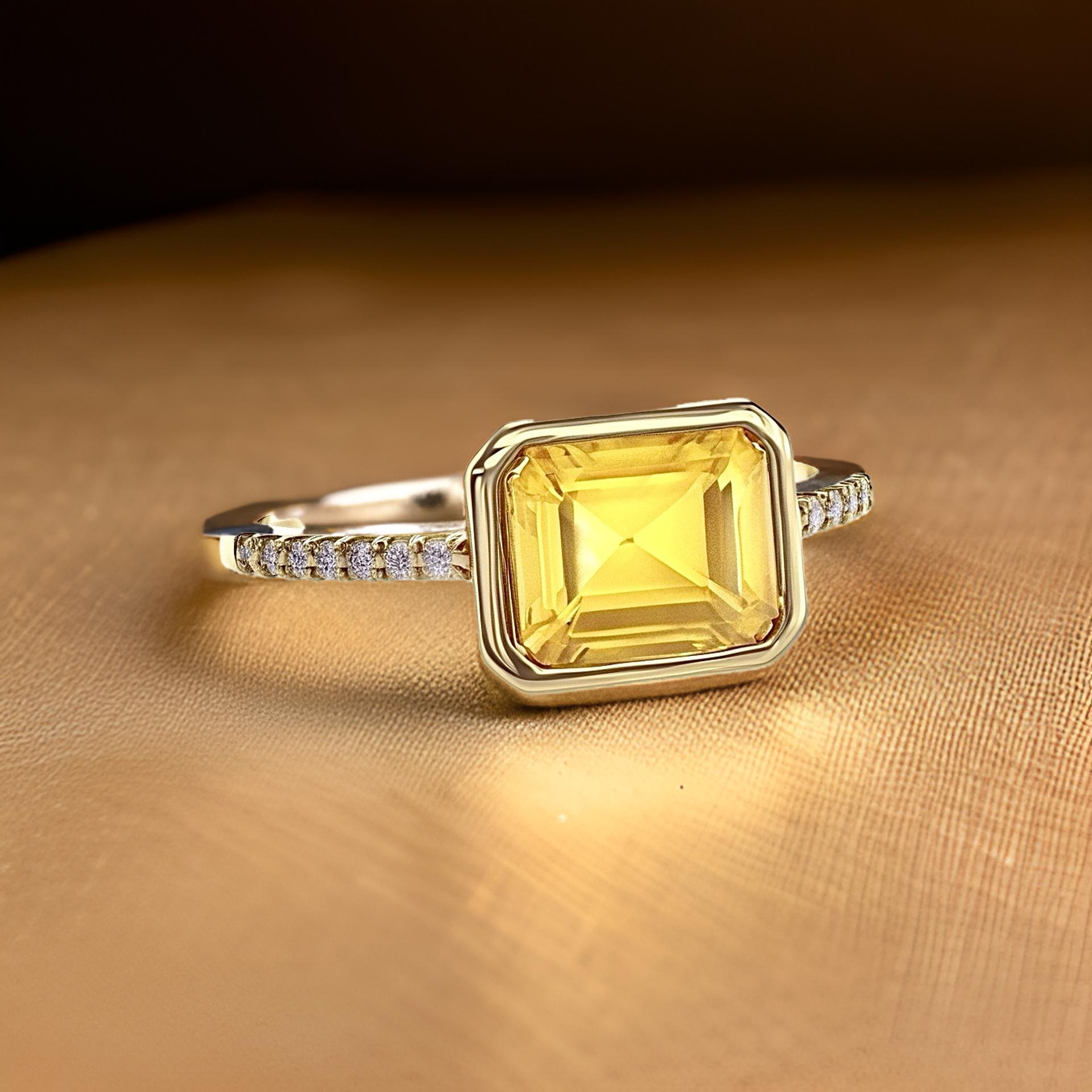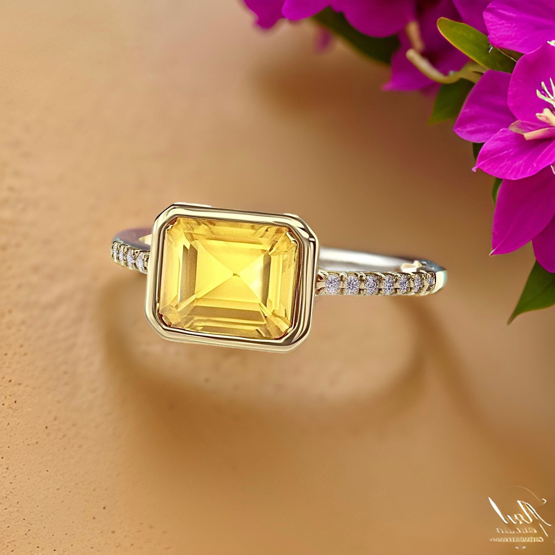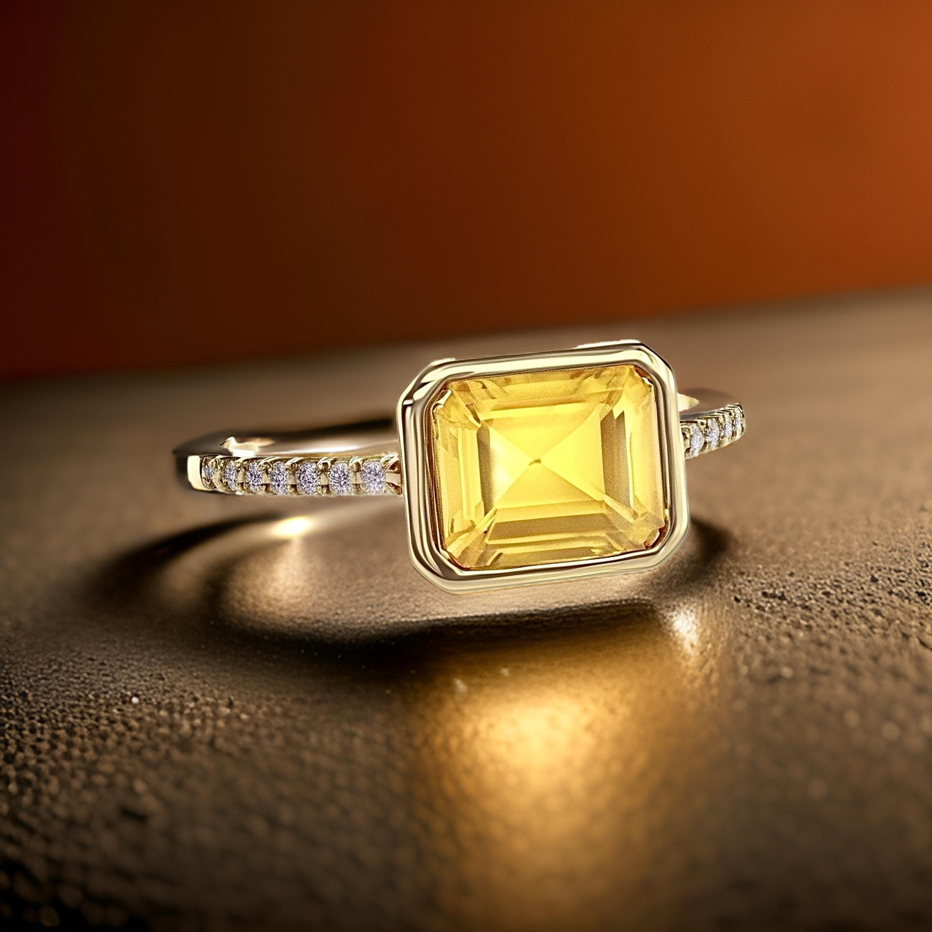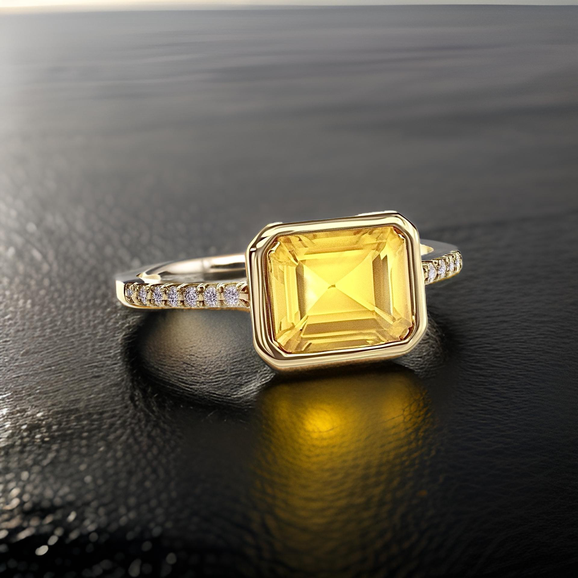 This radiant ring features a beautifully faceted rectangular natural citrine as the centerpiece, showcasing its golden-yellow hue with vibrant clarity. The citrine, expertly cut to enhance its brilliance, emits a warm glow that reflects elegance and sophistication.
