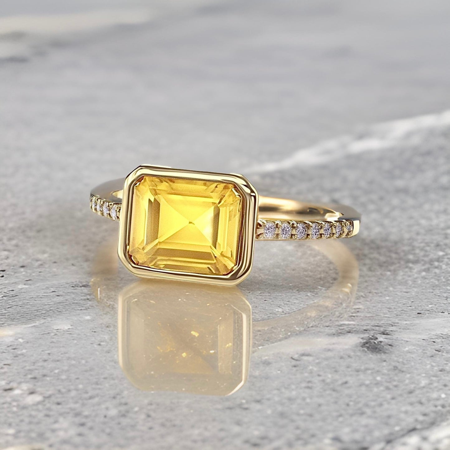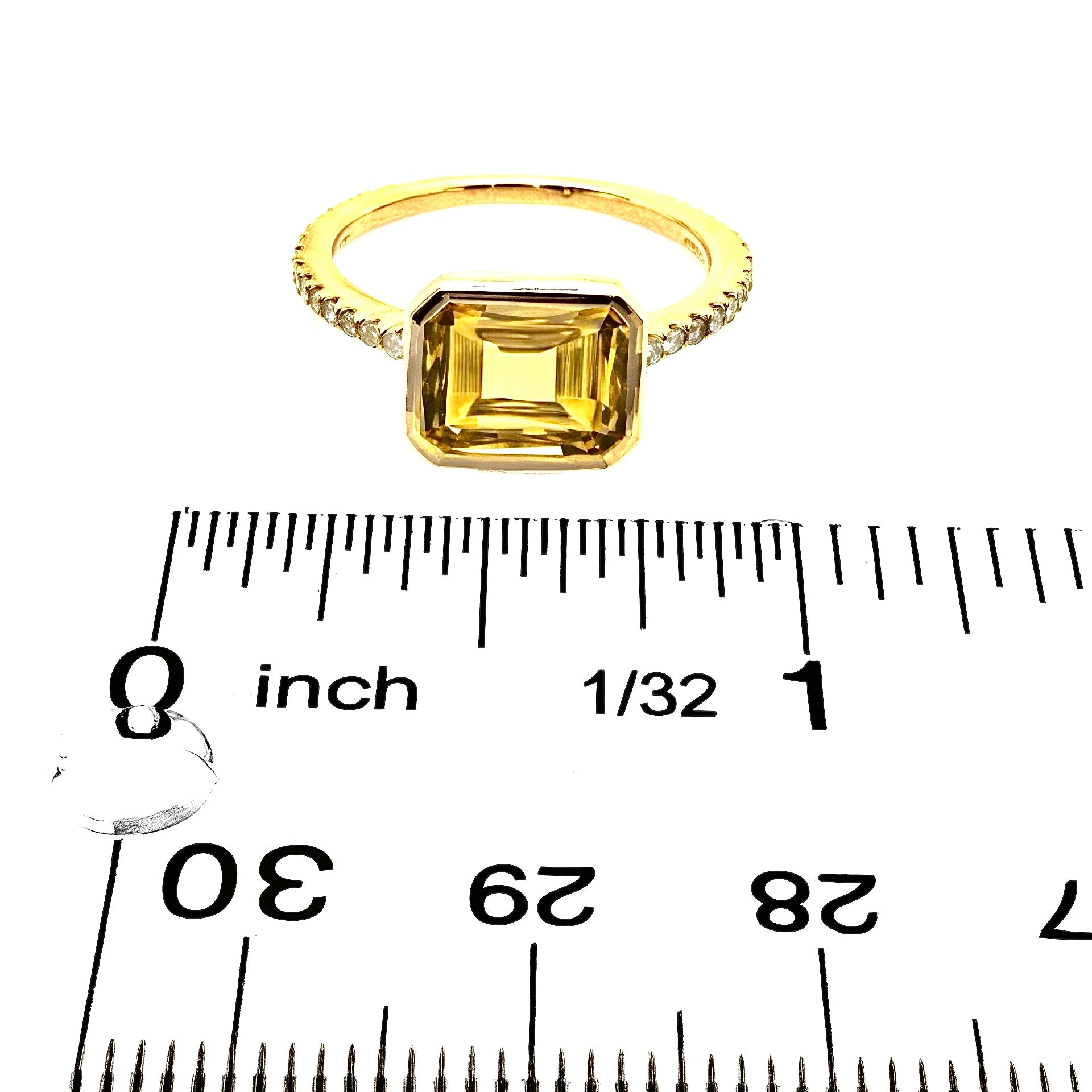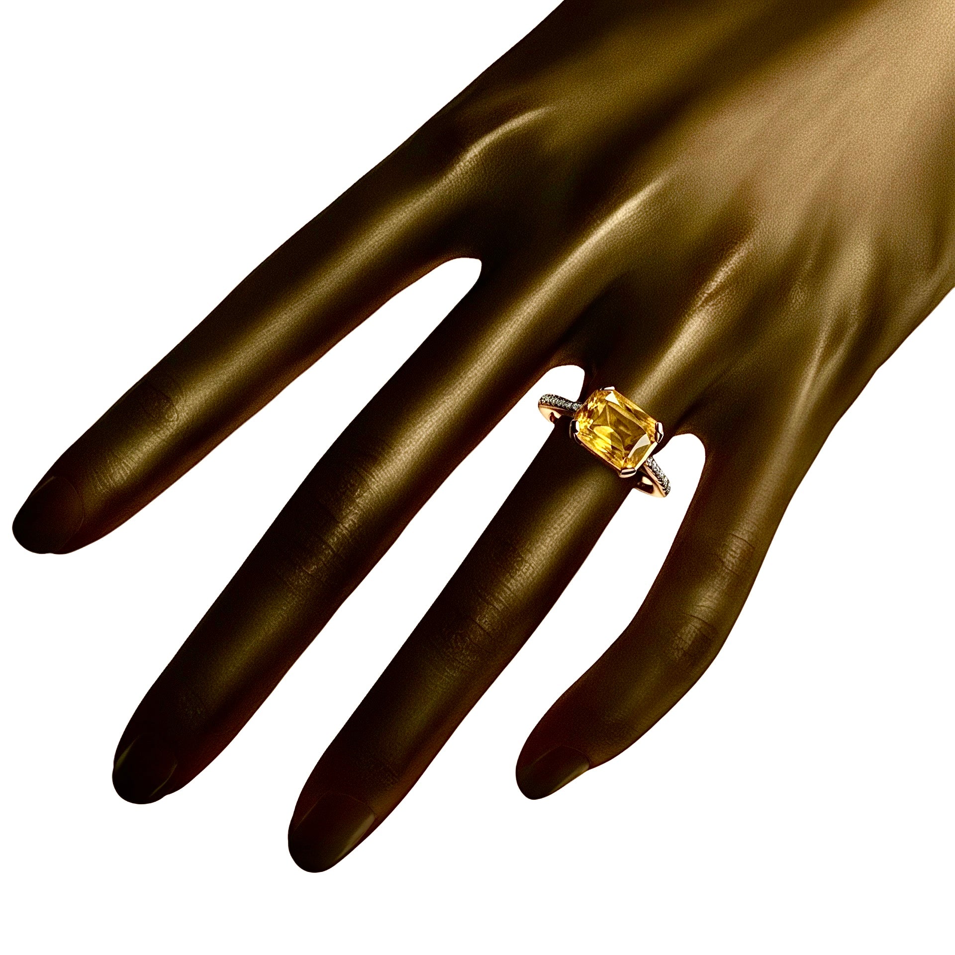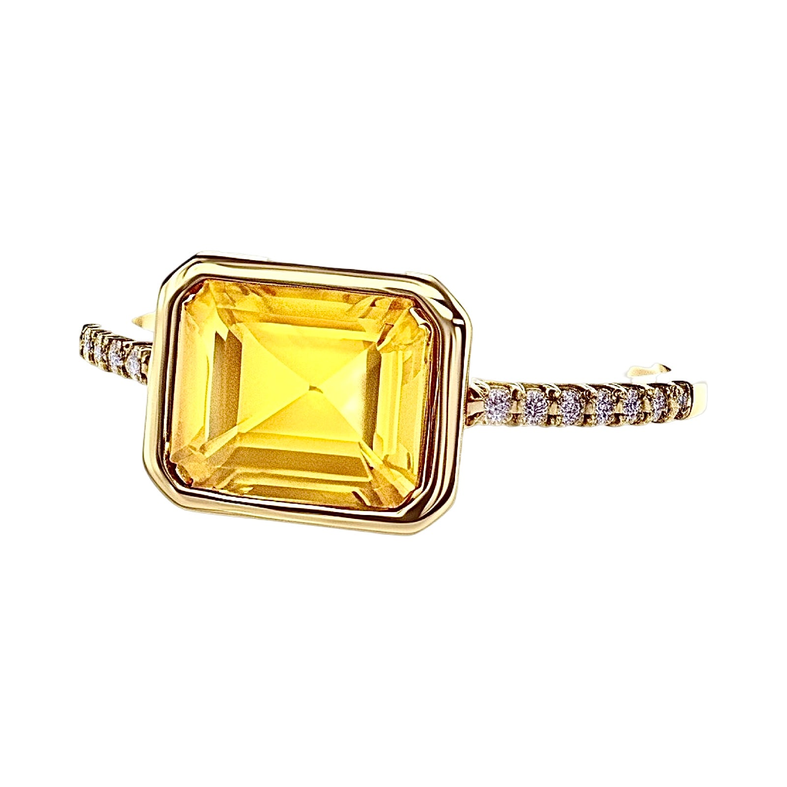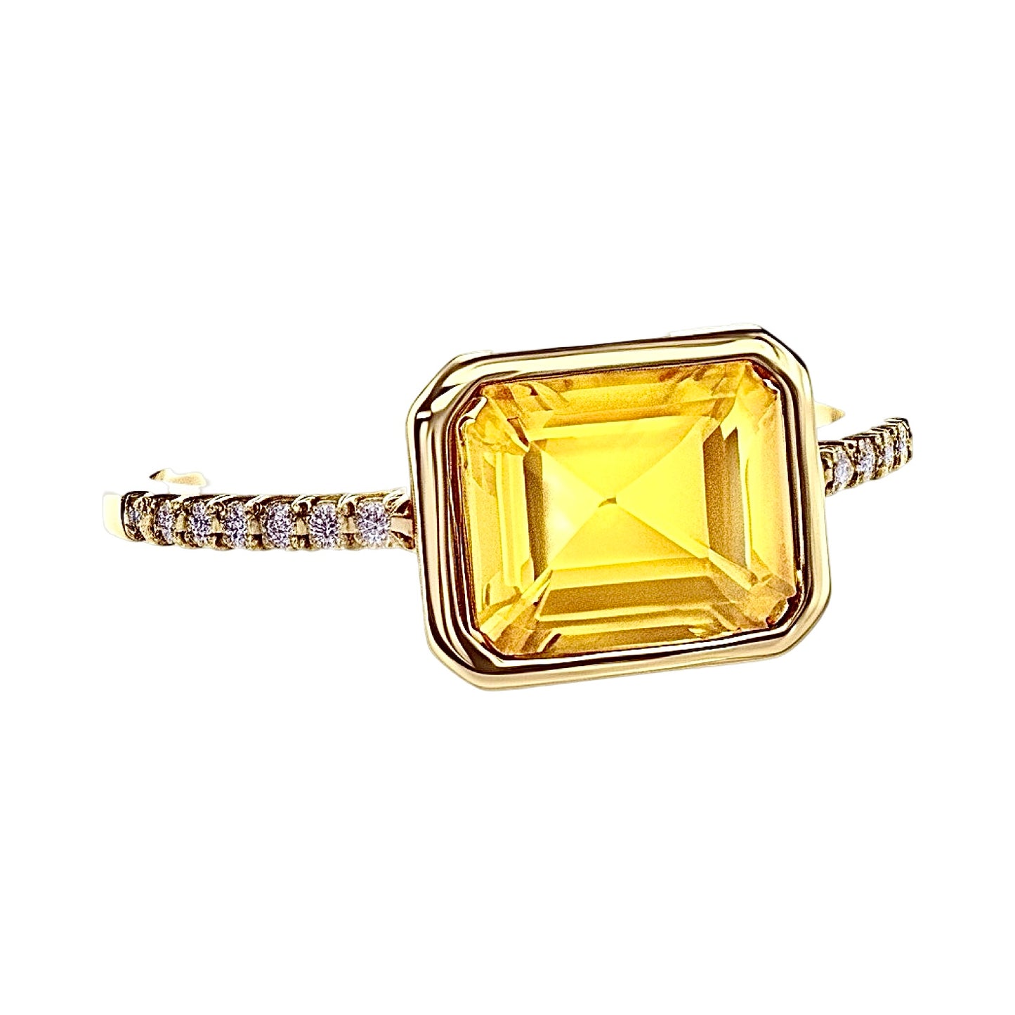 This radiant ring features a beautifully faceted rectangular natural citrine as the centerpiece, showcasing its golden-yellow hue with vibrant clarity. The citrine, expertly cut to enhance its brilliance, emits a warm glow that reflects elegance and sophistication.